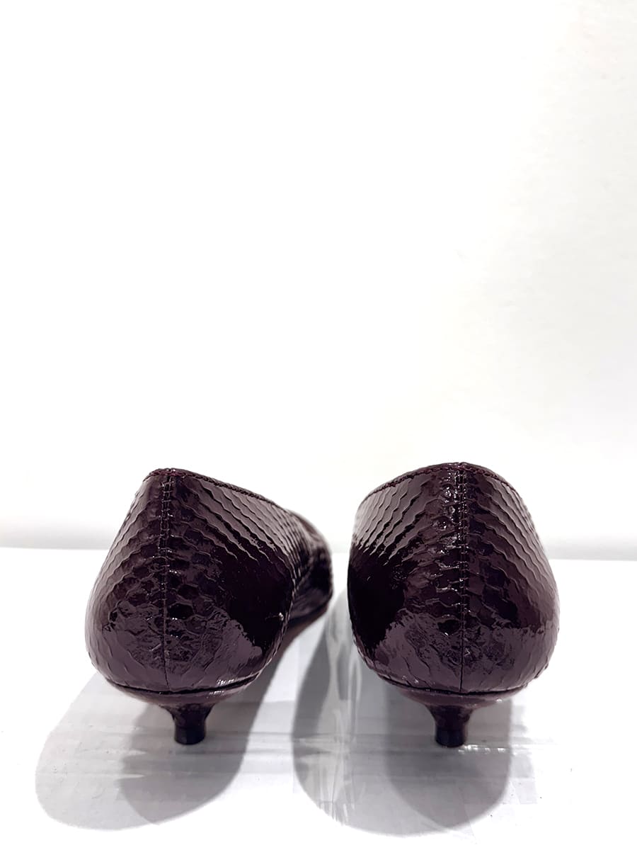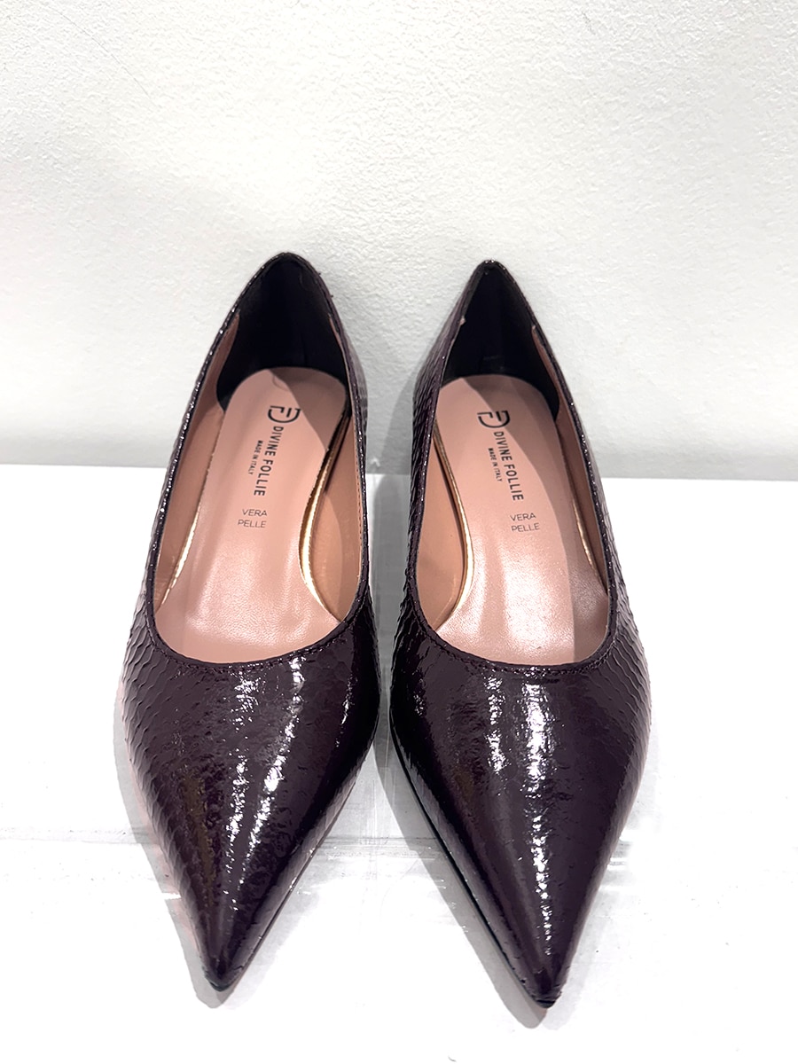 Decolletè in vernice stampa pitone , a punta , colore bordeaux.