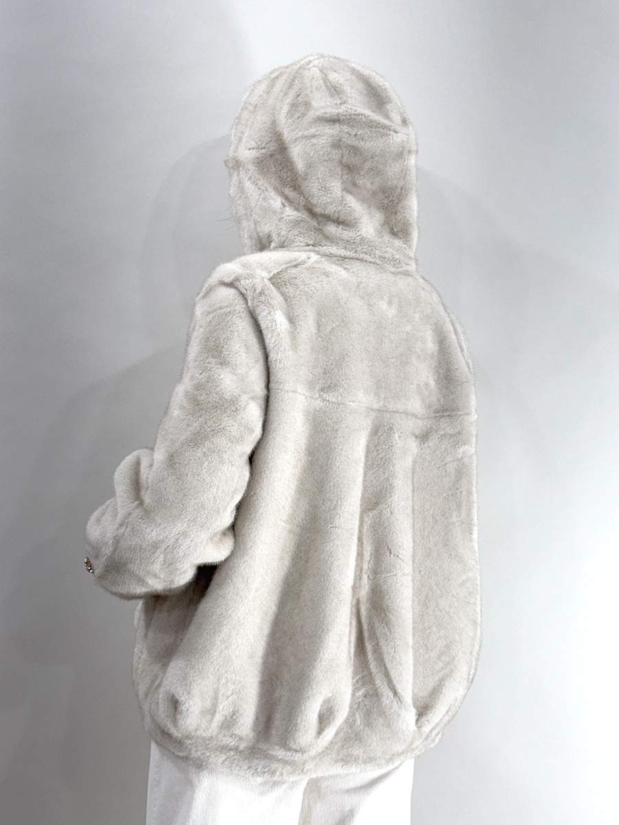 Texture soffice e lucente. Cappuccio ampio , chiusura frontale con bottone gioiello e maniche leggermente ballon con dettagli decorativi ai polsini.