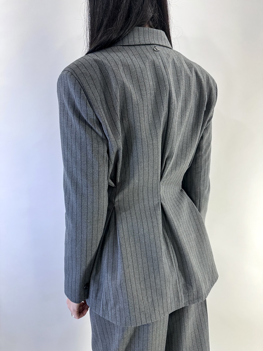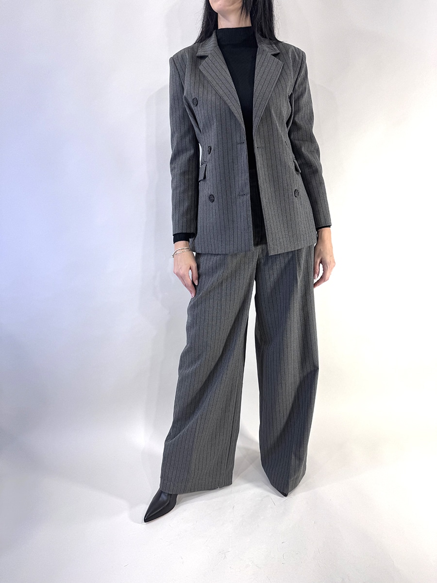 Giacca doppiopetto colore grigio antracite a righe sottili e verticali dal taglio strutturato e sartoriale.