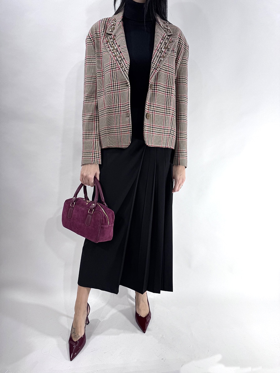 Giacca check classica e ricercata con pietre applicate nel rever che impreziosiscono il capo.