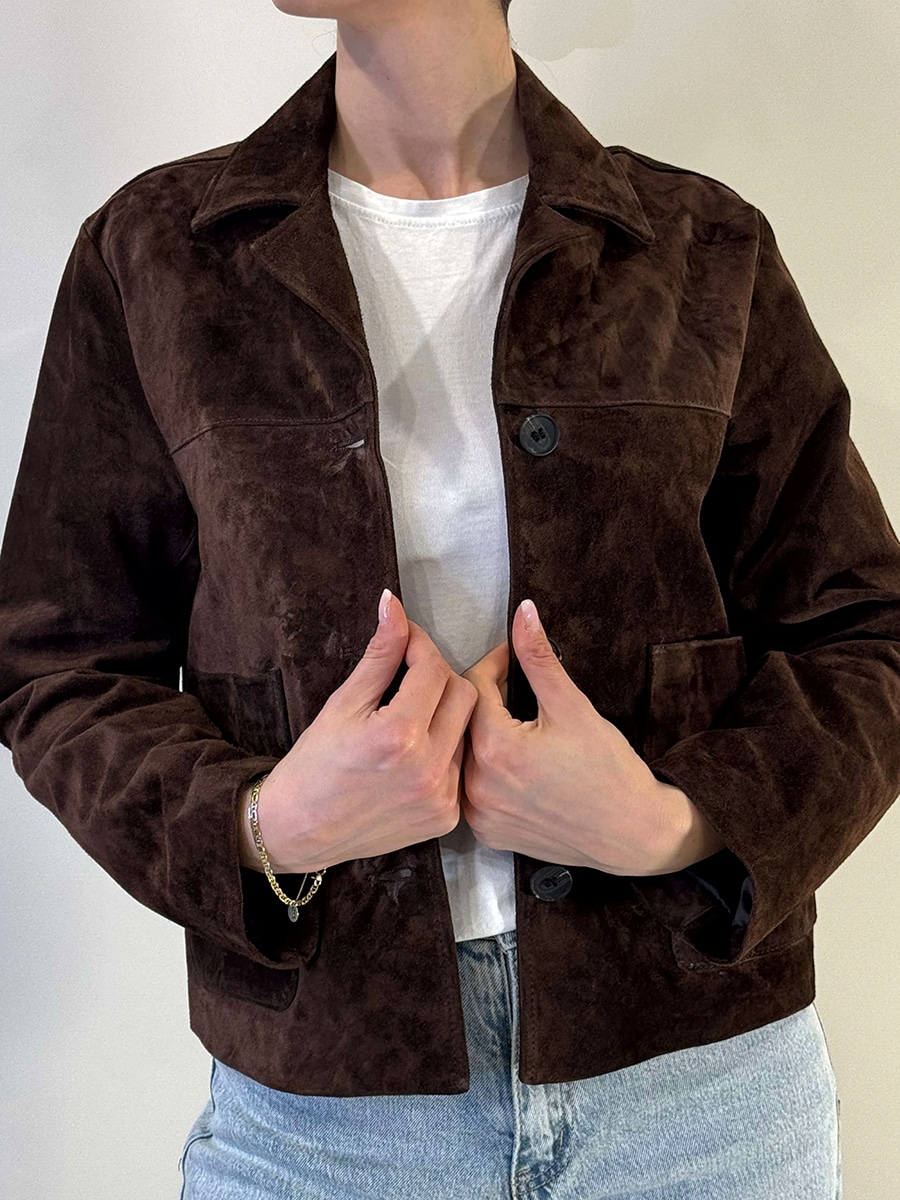 Giacca corta monopetto maniche lunghe con colletto. Tasche frontali applicate. Chiusura con bottoni