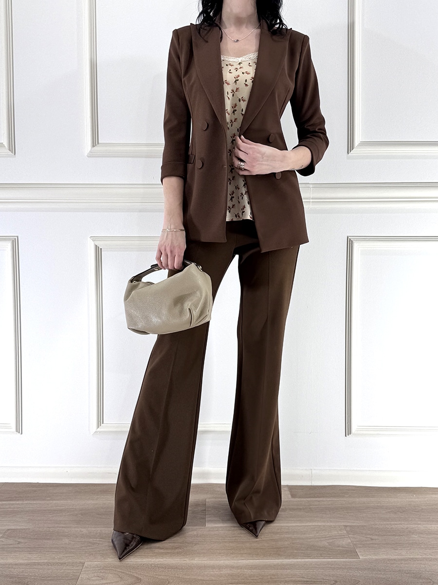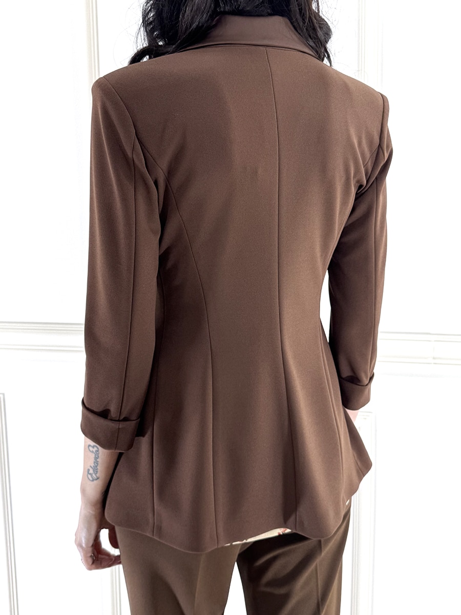 Giacca doppio petto color cacao dal taglio sartoriale, realizzata in tessuto fluido e strutturato. Linea femminile con revers classici, maniche a tre quarti con risvolto e chiusura con bottoni tono su tono. Vestibilità elegante che valorizza la silhouette, perfetta se abbinata al pantalone coordinato per un completo raffinato e versatile.