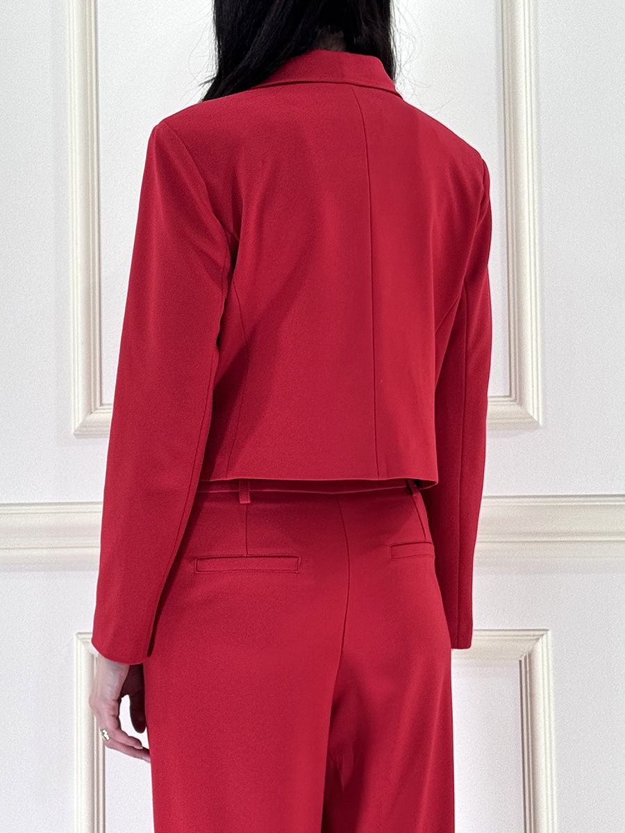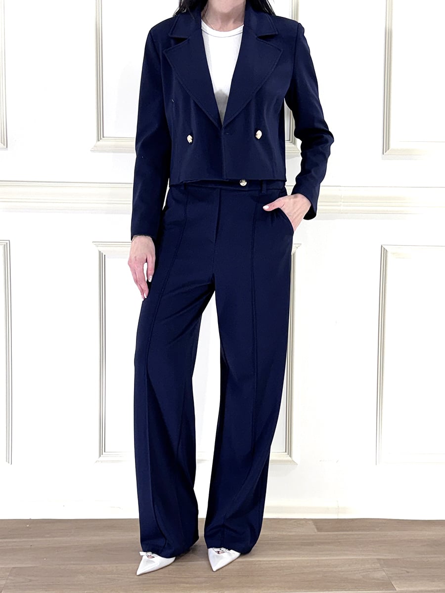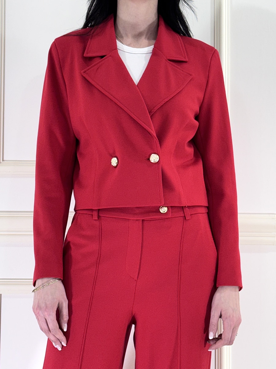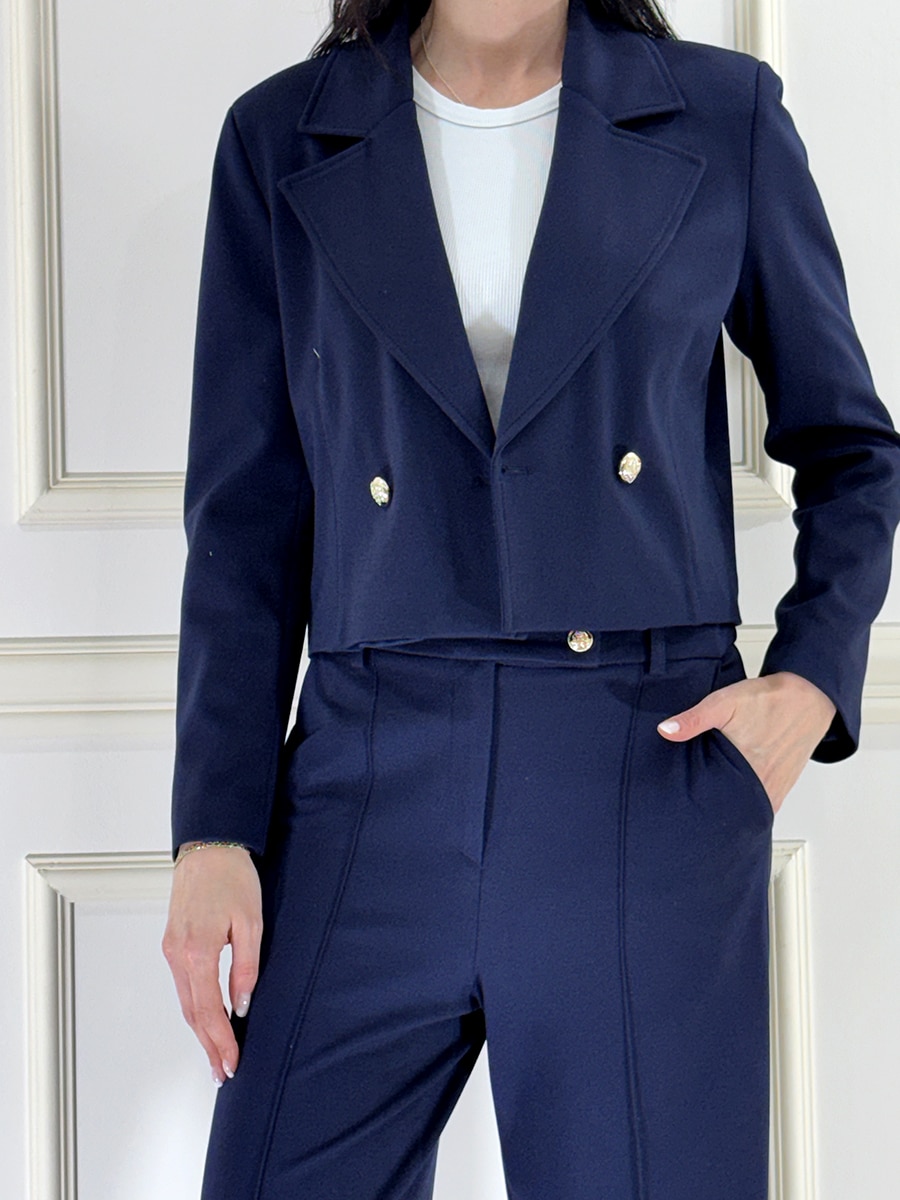 Giacca corta doppiopetto con bottoni color oro , fodera interna. Tessuto elasticizzato tipo punto milano , design strutturato con spalline.