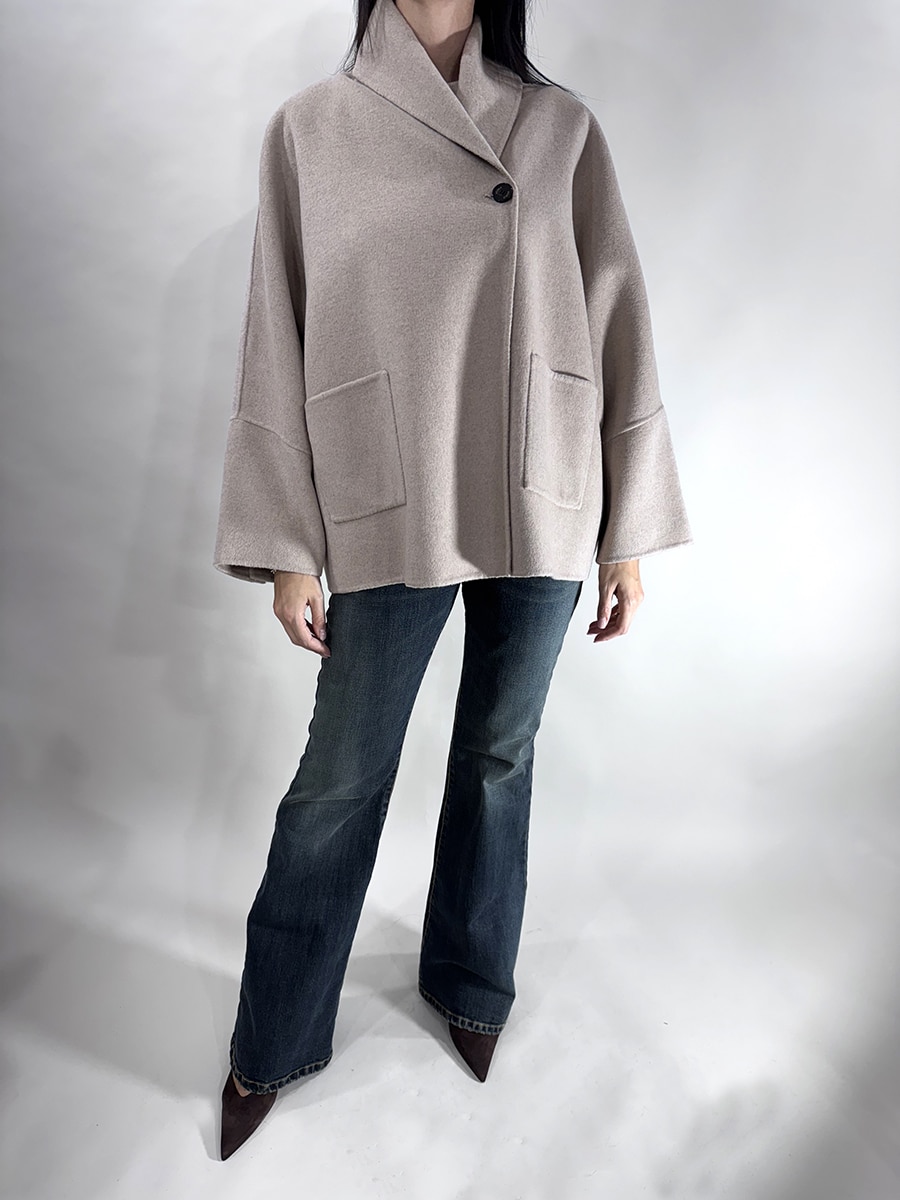 Giacca in lana color beige dal volume morbido e linea leggermente over, con collo avvolgente e chiusura asimmetrica ad un bottone. Maniche ampie che richiamano la silhouette di una cappa. Un capo essenziale e raffinato, perfetto per look minimal e contemporanei.