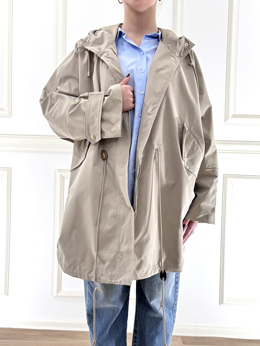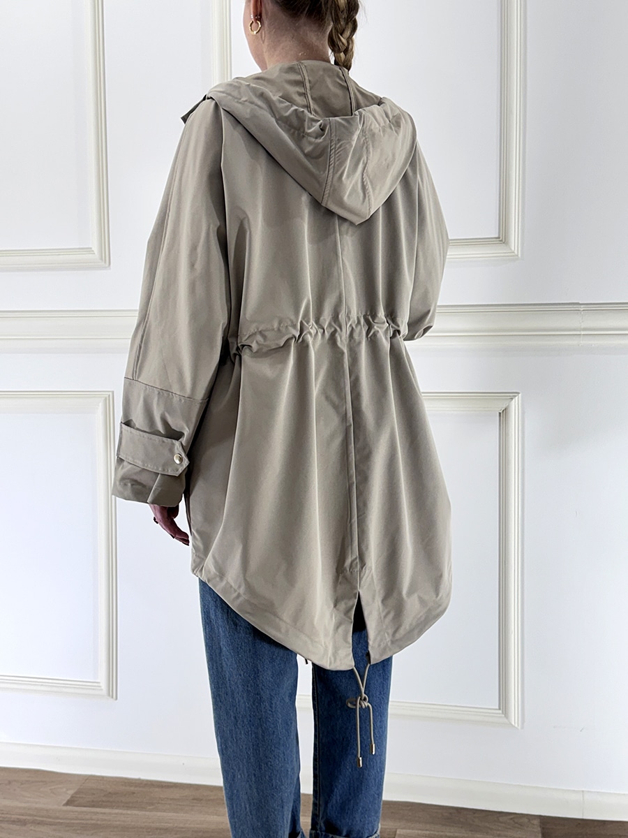 Giacca impermeabile lunga , arricciatura sul retro e bottoni sul davanti, cappuccio. Tasche laterali e fodera interna. Linea semplice e pulita.