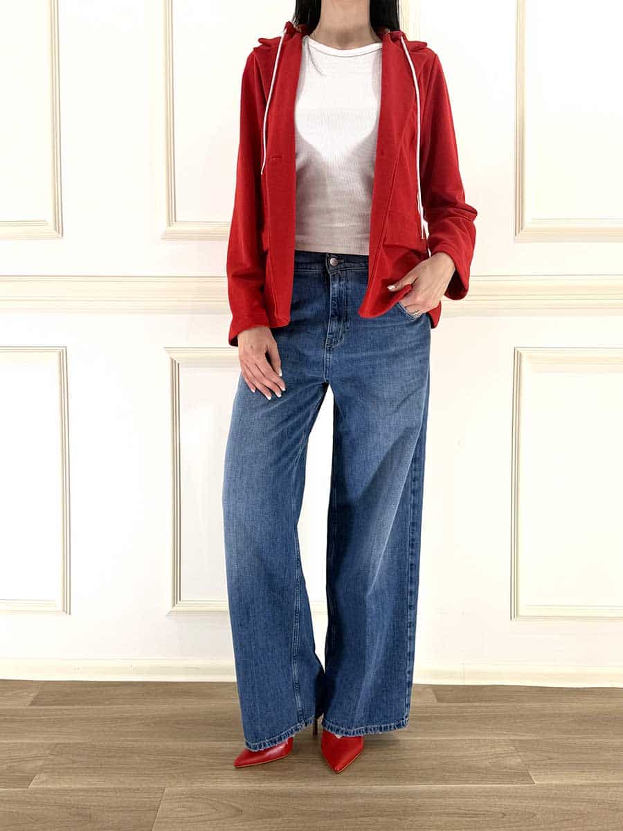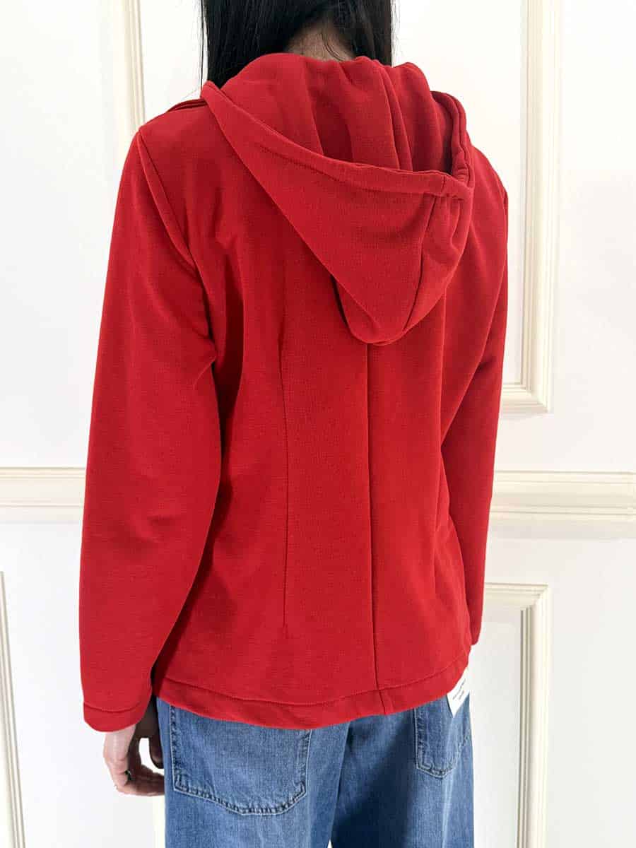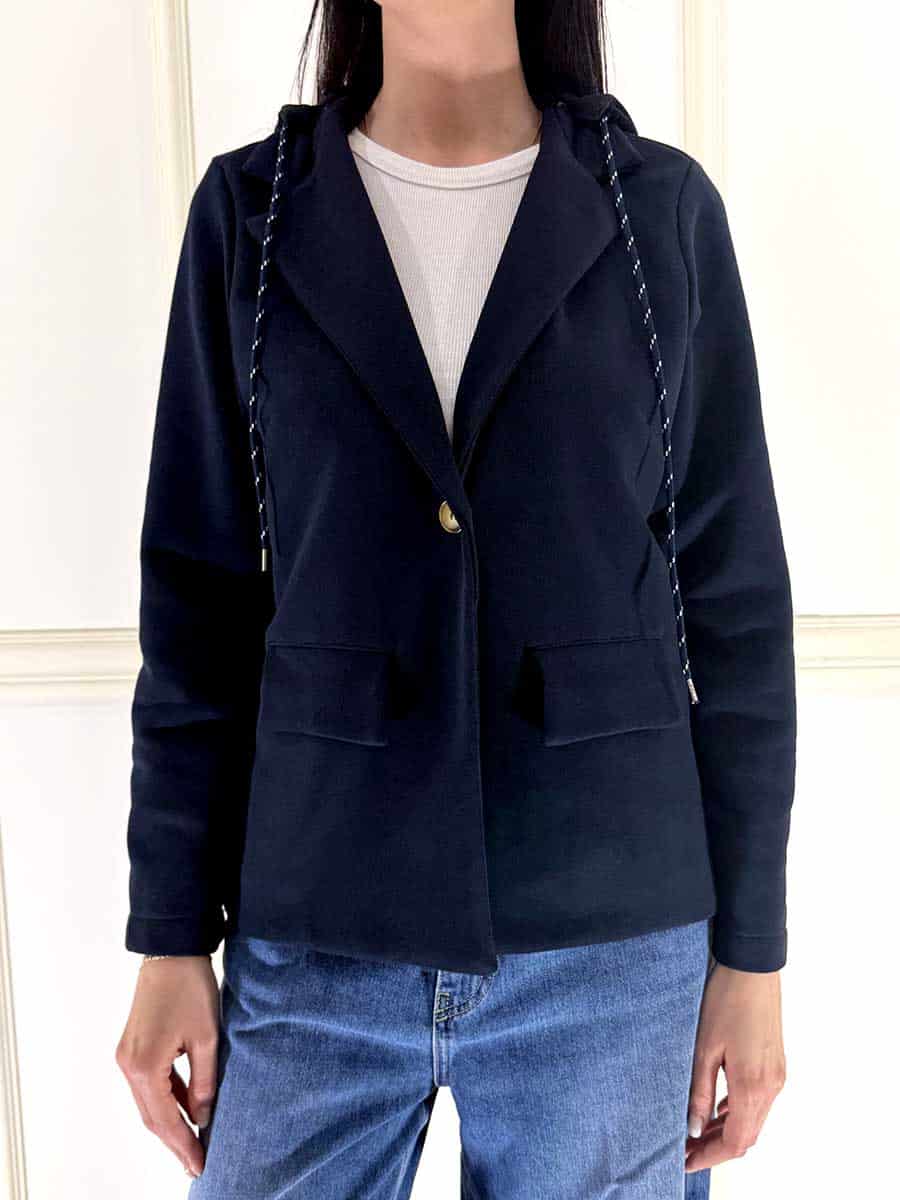 Giacca in felpa senza fodera interna, modello un petto con cappuccio staccabile.