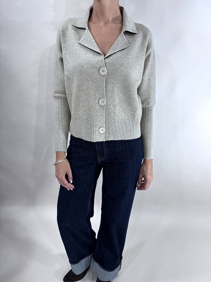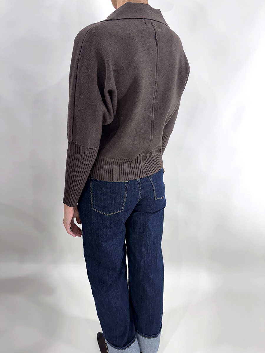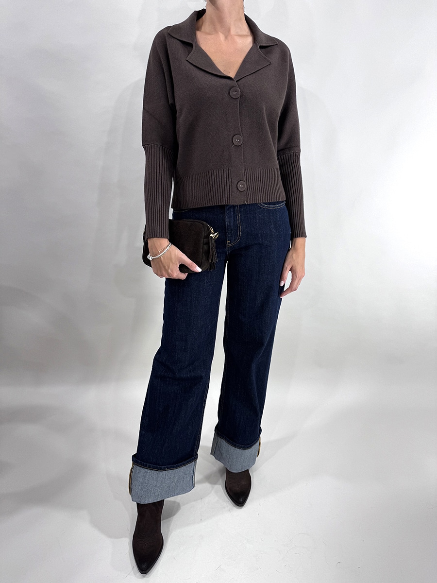 Giacca rever in maglia con colletto aperto, chiusura a tre bottoni e maniche lunghe a coste. Disponibile nei colori moro e kasha