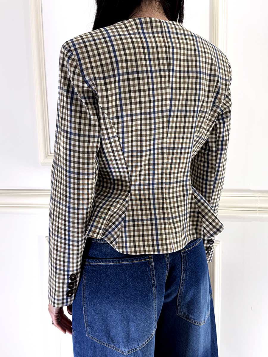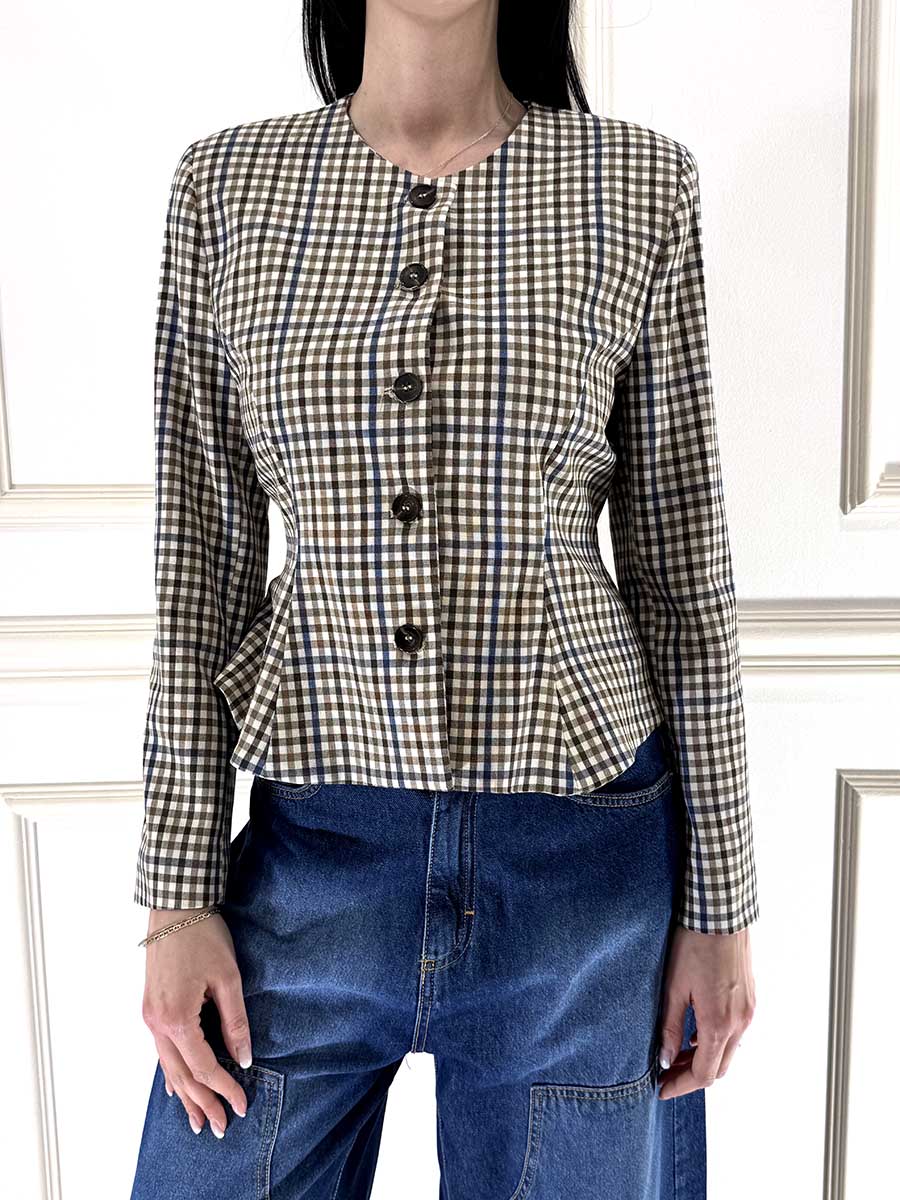 Giacca sfiancata a quadretti,collo alla coreana, bottoncini sul davanti per la chiusura, spalline imbottite che regalano struttura al capo.