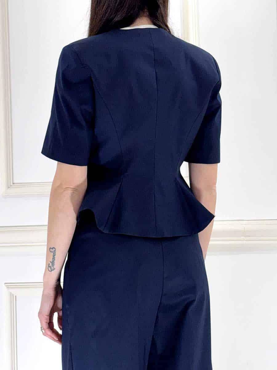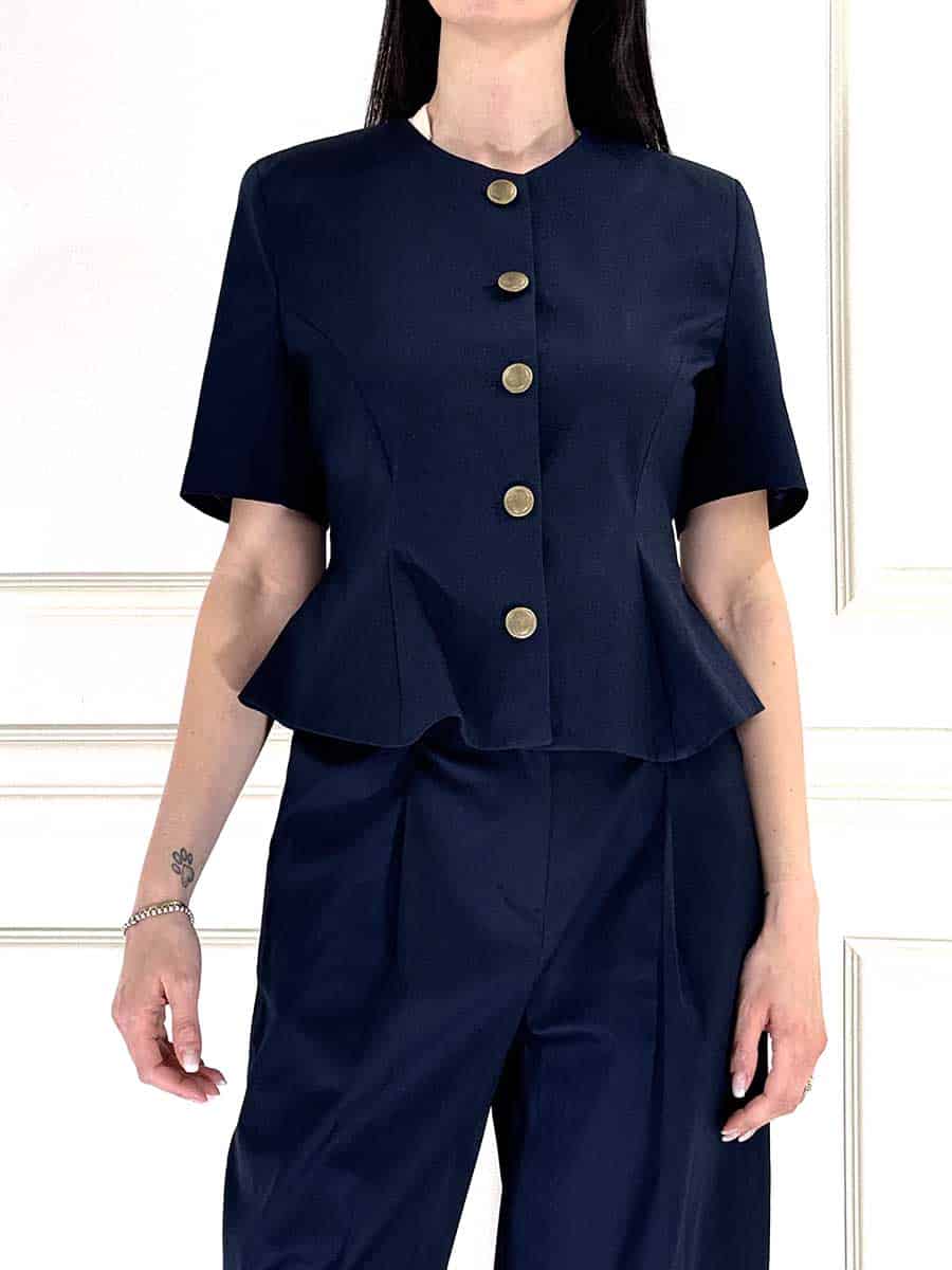 Giacca sfiancata mezza manica in cotone che slancia e delinea la silhouette, spalline imbottite che donano struttura e bottoni davanti per la chiusura.