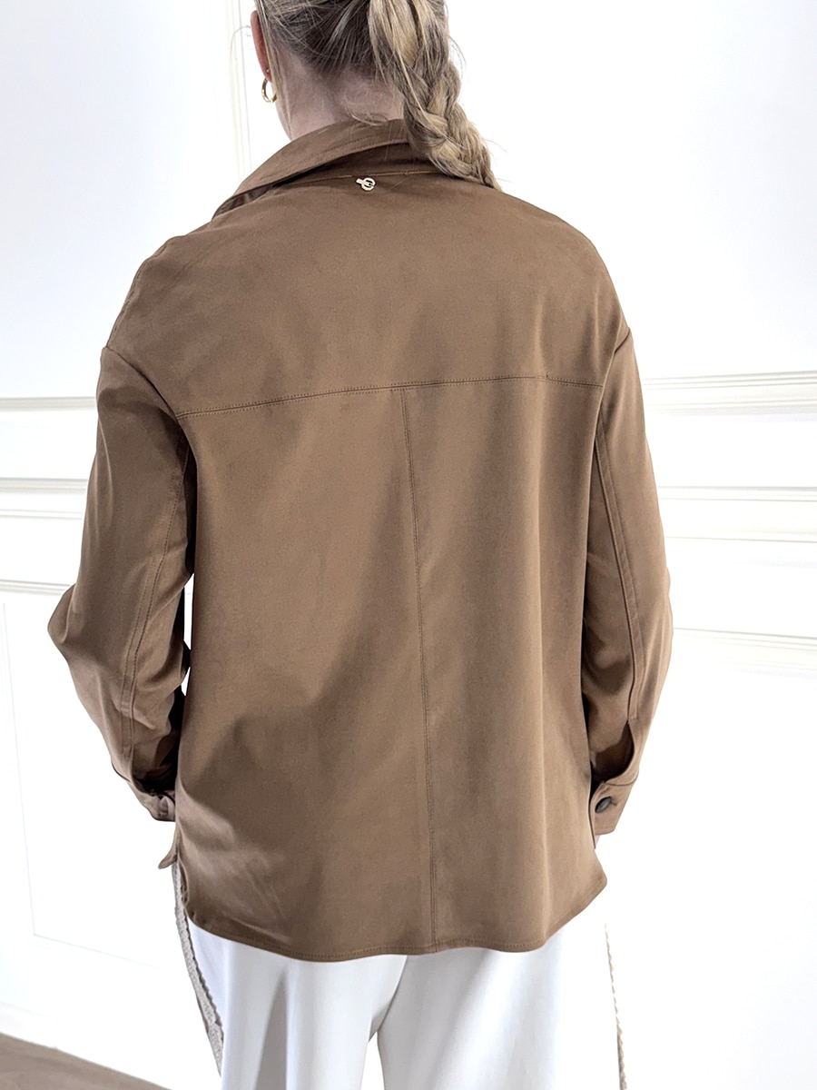 Giacca simil suede con colletto regolare e bottoni davanti per la chiusura, tasche davanti che conferiscono uno tocco contemporaneo al capo.