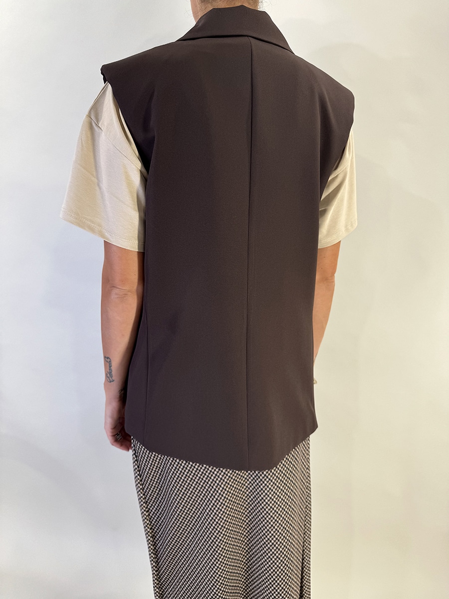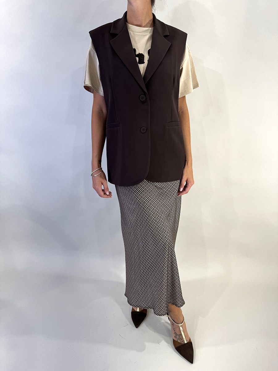 Gilet lungo , modello un petto , tessuto fluido , fodera interna in stampa pied de poule