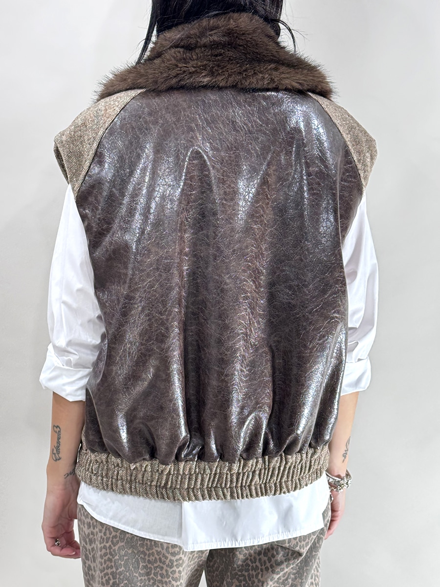 Gilet con inserto in ecofur nel collo, retro in ecopelle , zip davanti per la chiusura ed elastico in fondo.