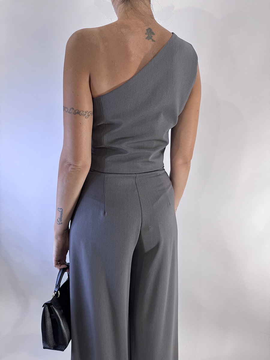Top grigio scuro monospalla con bottoni frontali e taschine a filetto, un capo originale e sofisticato perfetto per look eleganti e moderni
