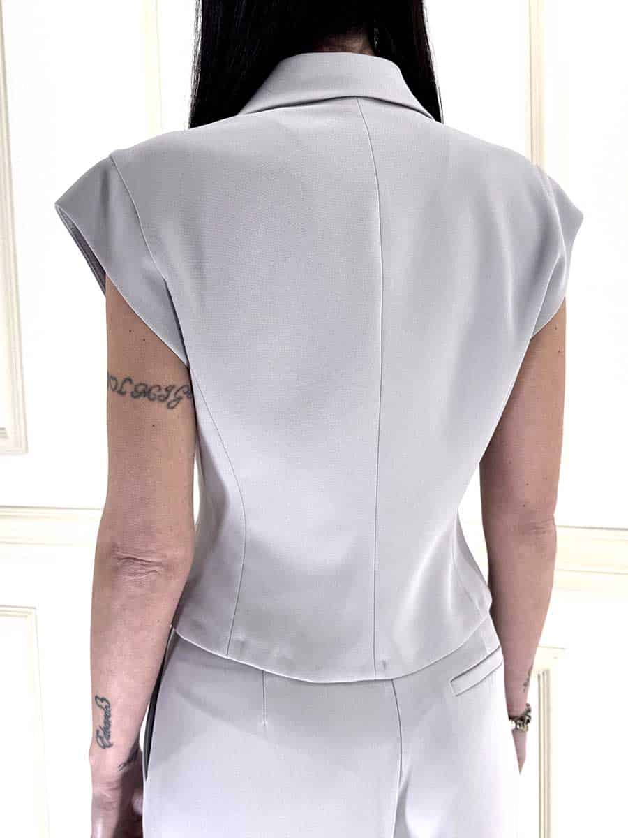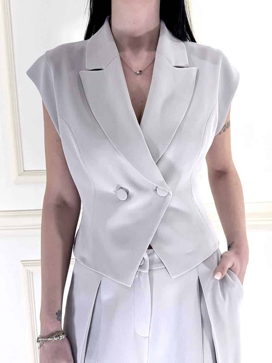 Gilet senza maniche con rever classico e doppia abbottonatura, caratterizzato da una linea strutturata che valorizza la silhouette.