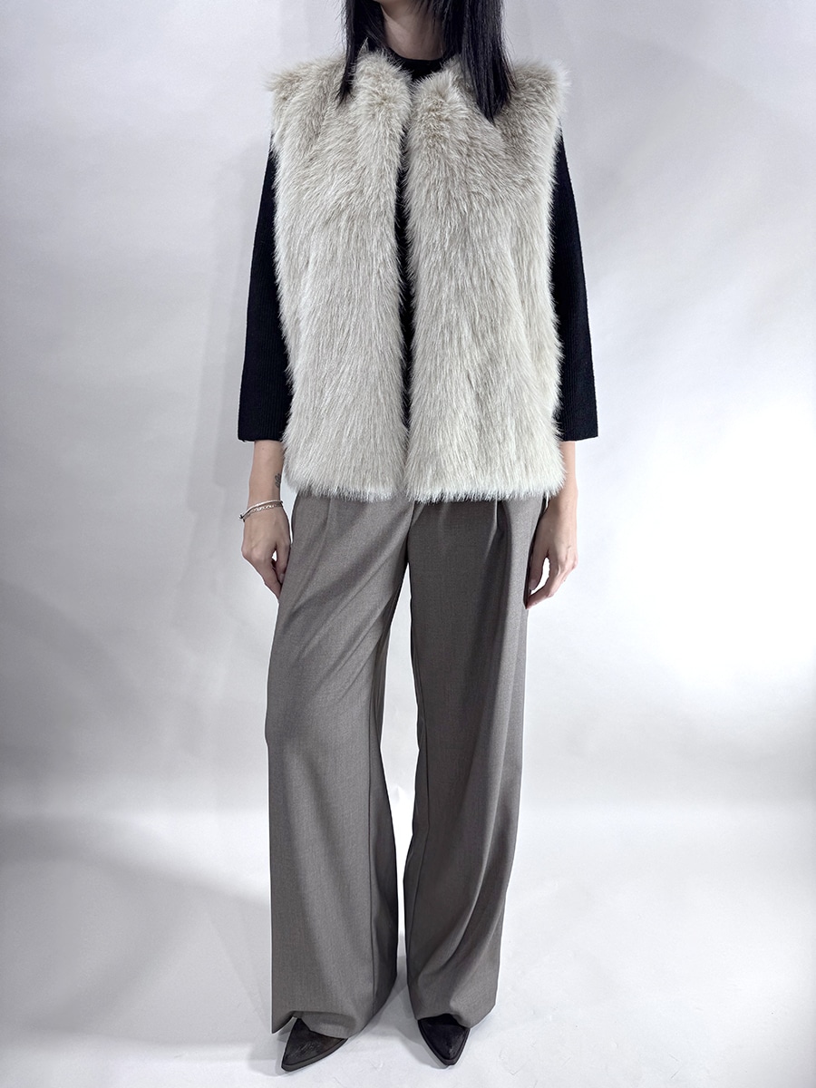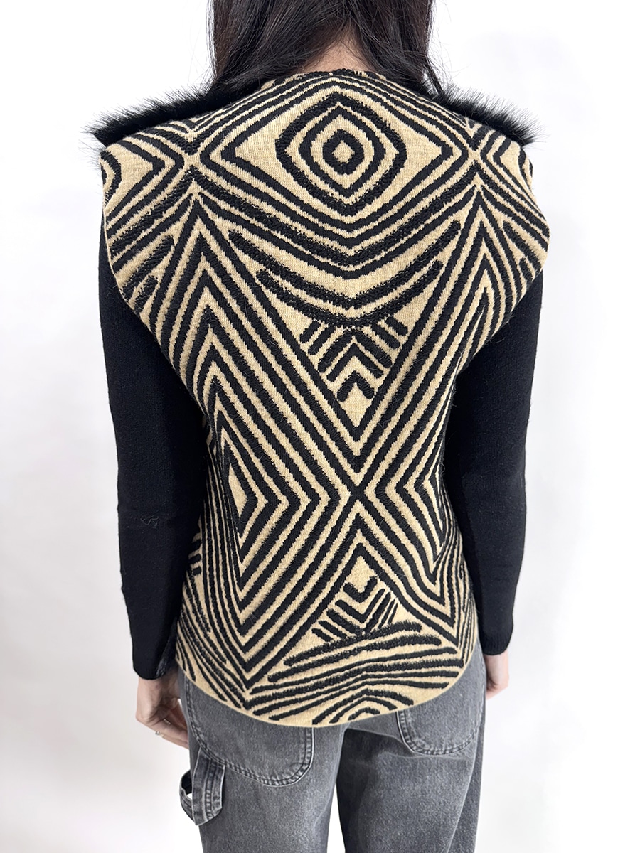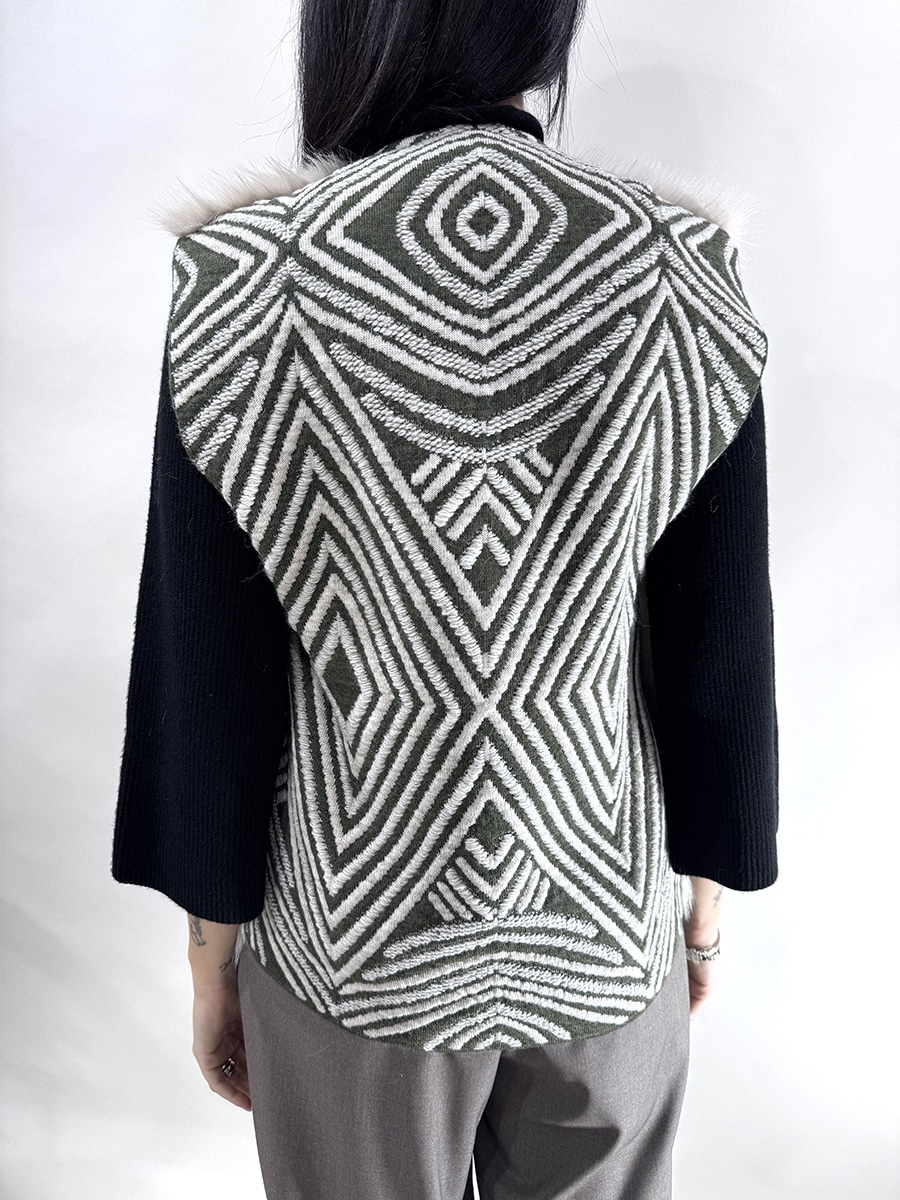 Gilet con inserti in ecopelliccia davanti e retro in maglia a righe diagonali bicolor, senza bottoni per la chiusura.