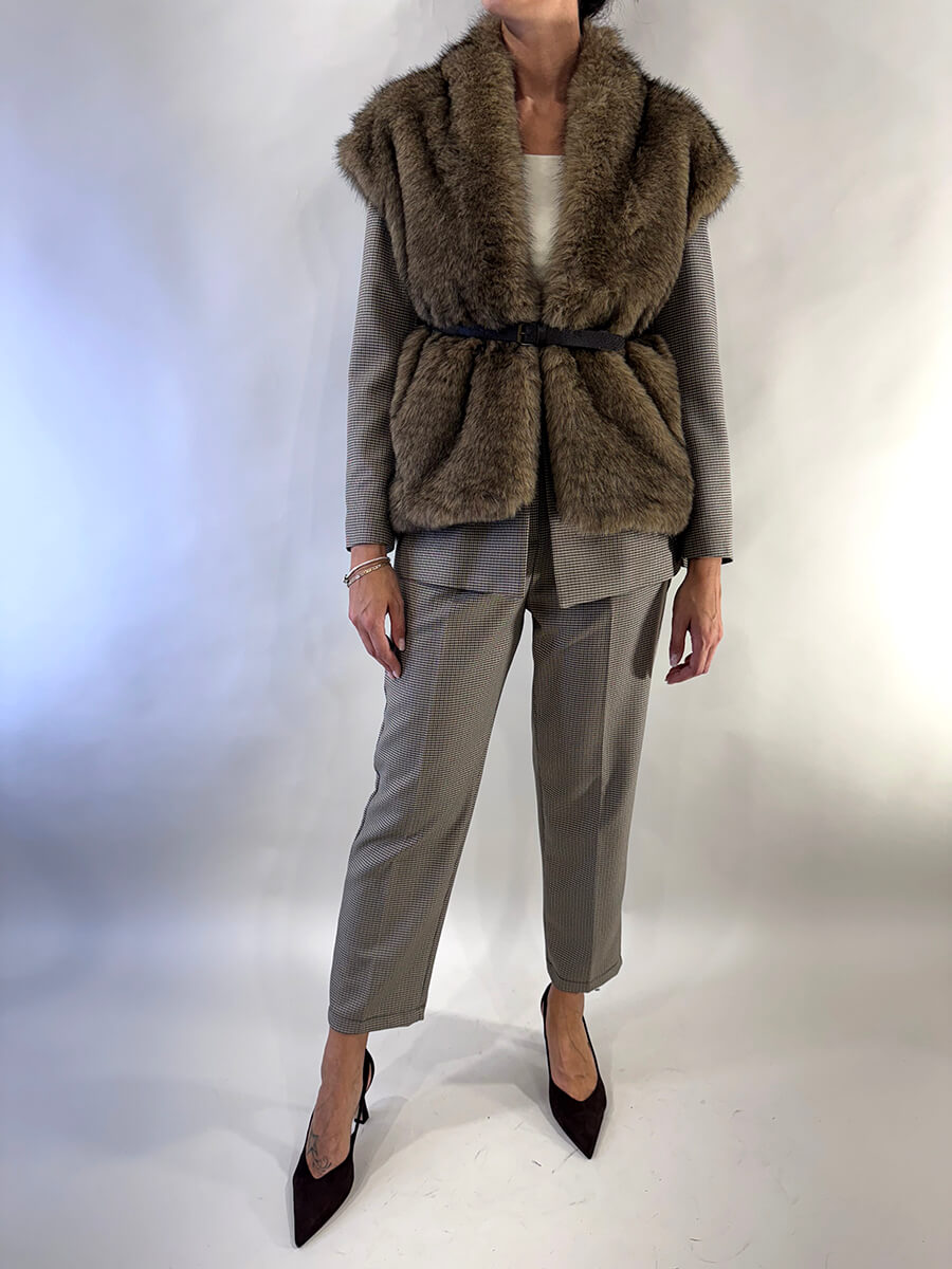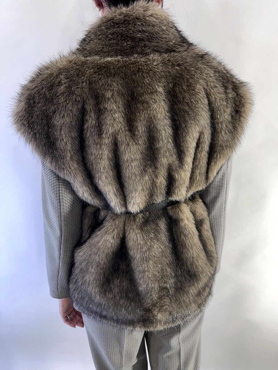 Gilet in ecopelliccia , voluminoso e morbido in tonalità marrone e naturale.