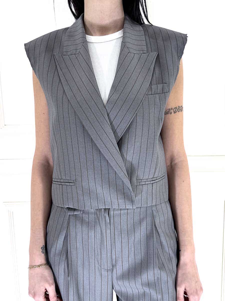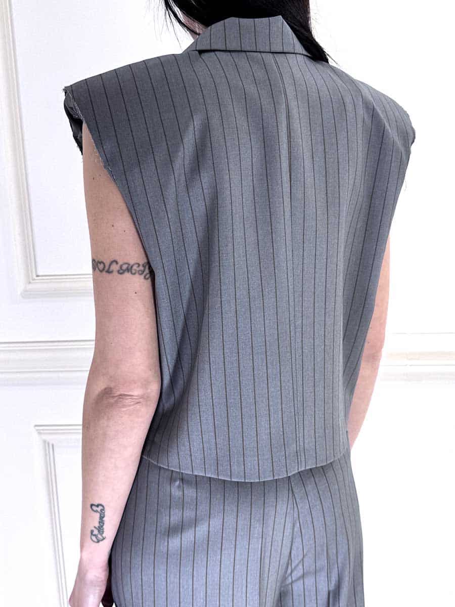 Gilet dallo stile moderno , spalline leggermente imbottite a vista, doppiopetto abbottonatura nascosta. Gessatura moro su base grigio, perfetto abbinato al suo pantalone per un total look raffinato.