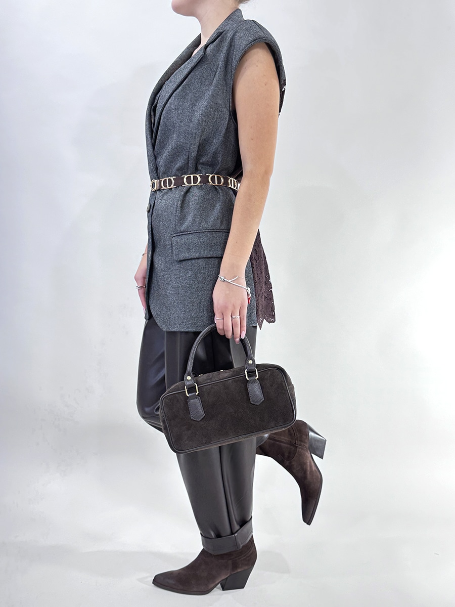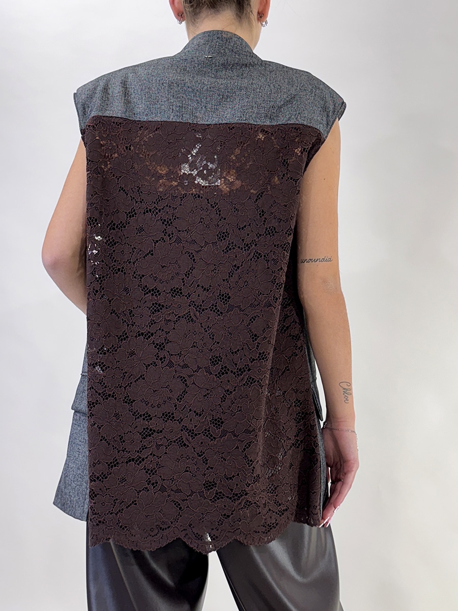 Gilet dal design sartoriale e ricercato, caratterizzato da un interessante mix di tessuti e txture.