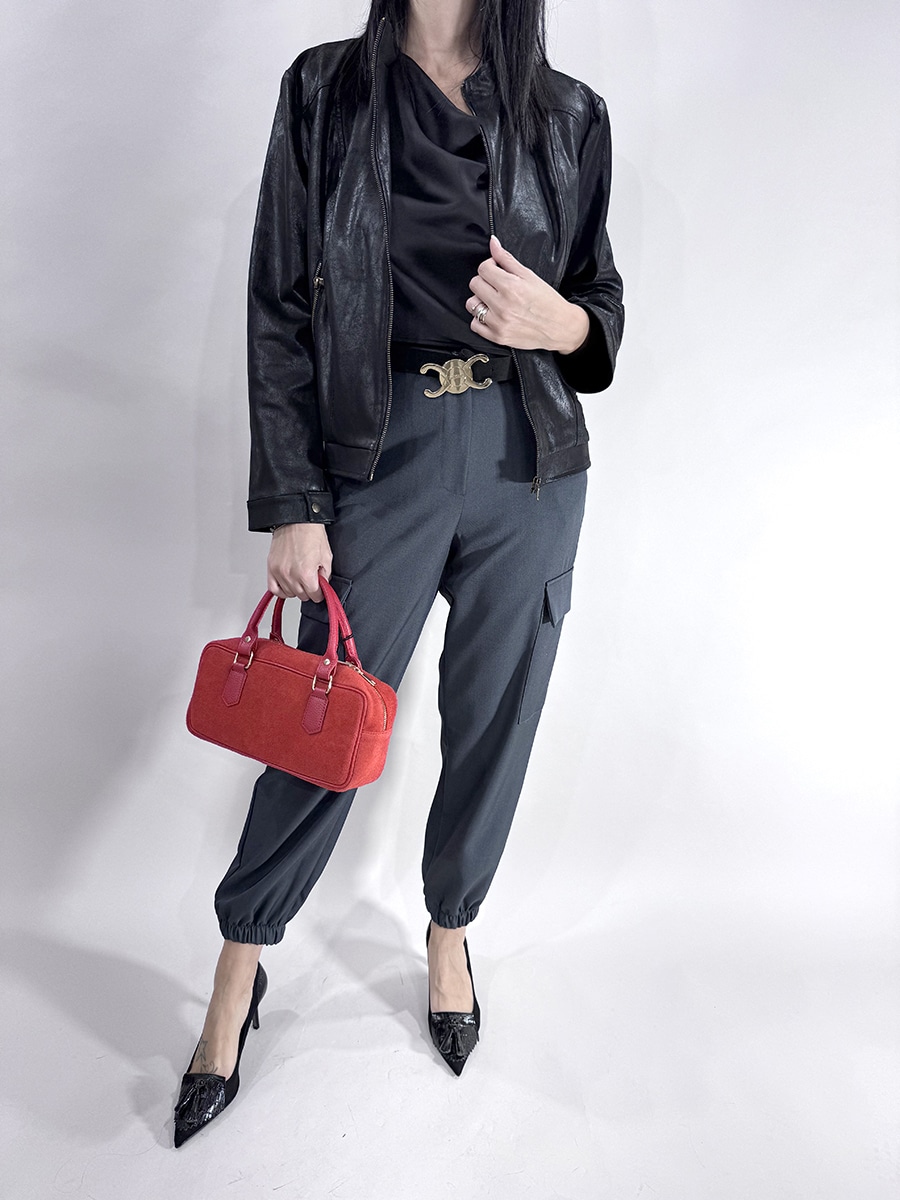 Giubbino in ecopelle , zip frontale per la chiusura, tasche con zip laterali.