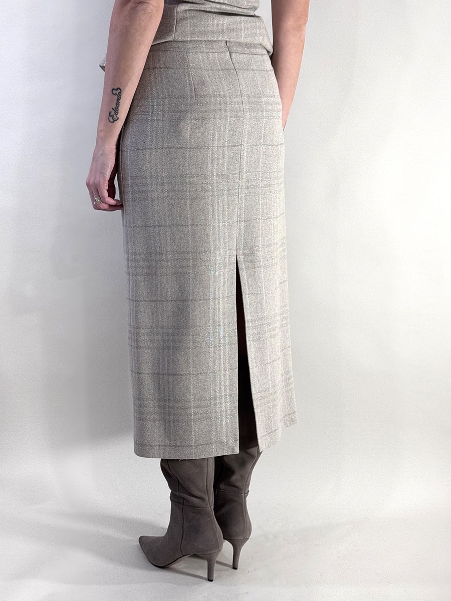 Gonna check in lana , modello dritto , zip invisibile sul retro per la chiusura, lurex nella trama rende il capo elegante e raffinato . spacco discreto sul retro.
