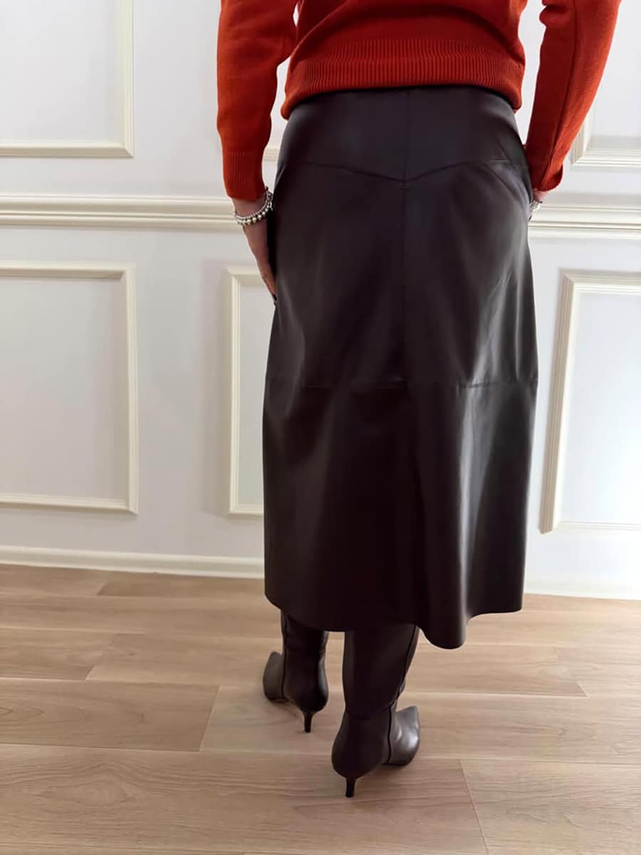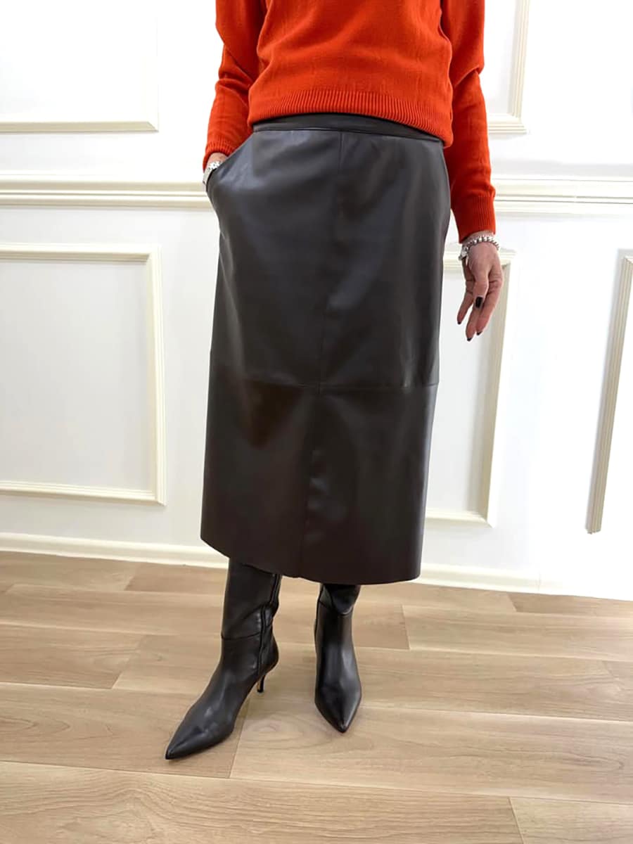 Gonna in ecopelle , zip invisibile per la chiusura. capo versatile adatto per look casual o eleganti , il tessuto in ecopelle conferisce un twist moderno al capo.