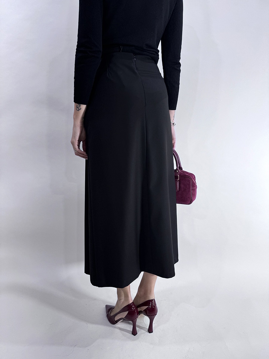 Colore nero. Lunghezza midi , con orlo che arriva appena sopra la caviglia slanciando la figura. Tessuto strutturato , modello a portafoglio con chiusura laterale. Pieghe piatte sul lato che aggiungono movimento e dinamicità al capo.
