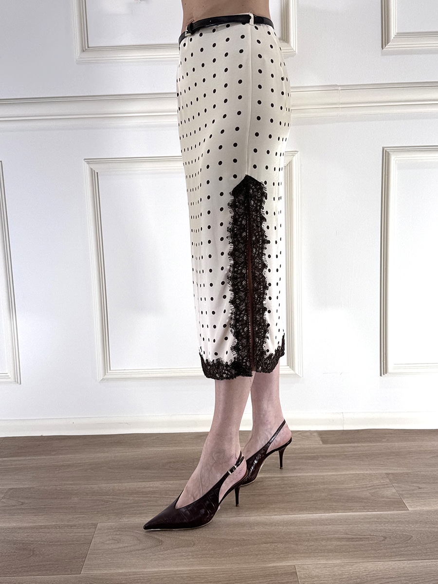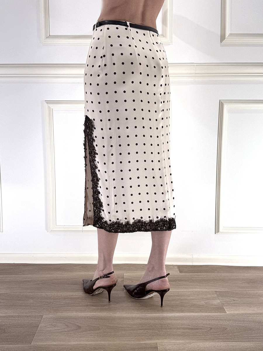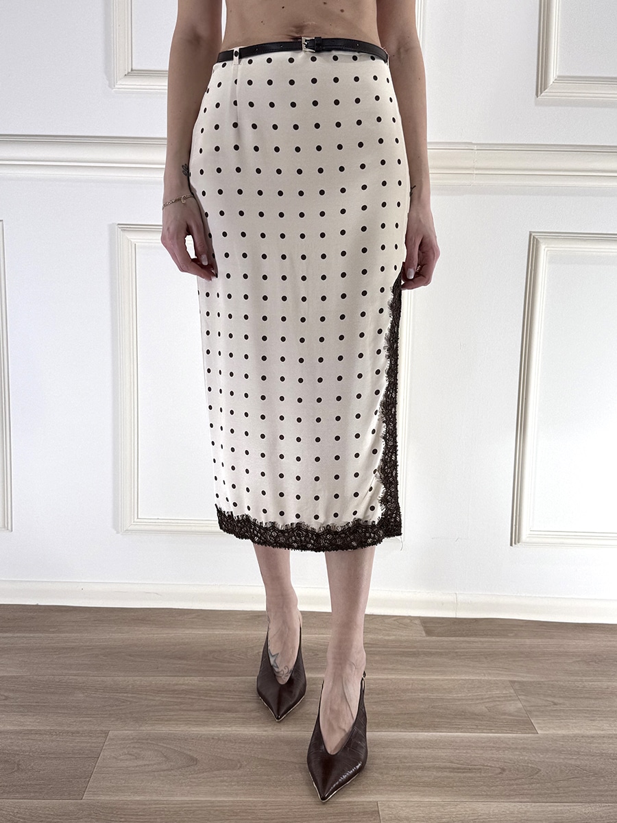 Gonna   a matita tessuto leggero a pois moro  su base burro , spacco laterale con pizzo  per un tocco elegante e raffinato, zip invisibile per la chiusura e cintura in dotazione,fodera interna fino a metà coscia.