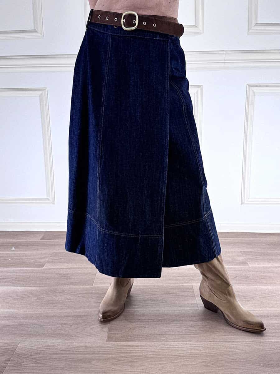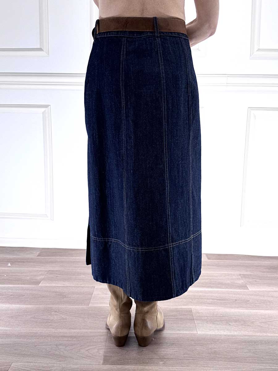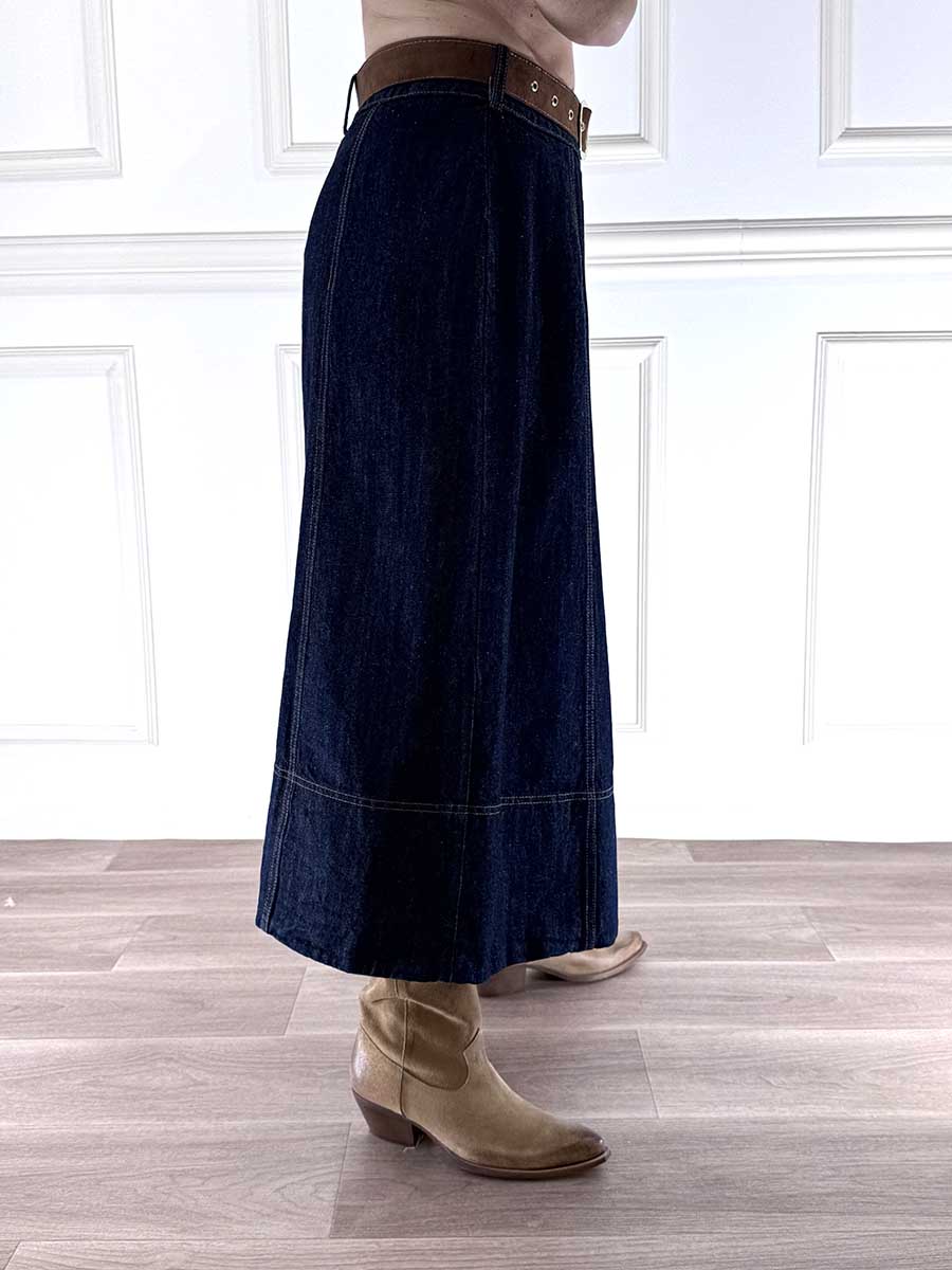 Gonna in denim chiusura a portafoglio dal design a trapezio, femminile e versatile. Cintura in camoscio che valorizza la silhouette e delinea il punto vita,cucitura in contrasto.