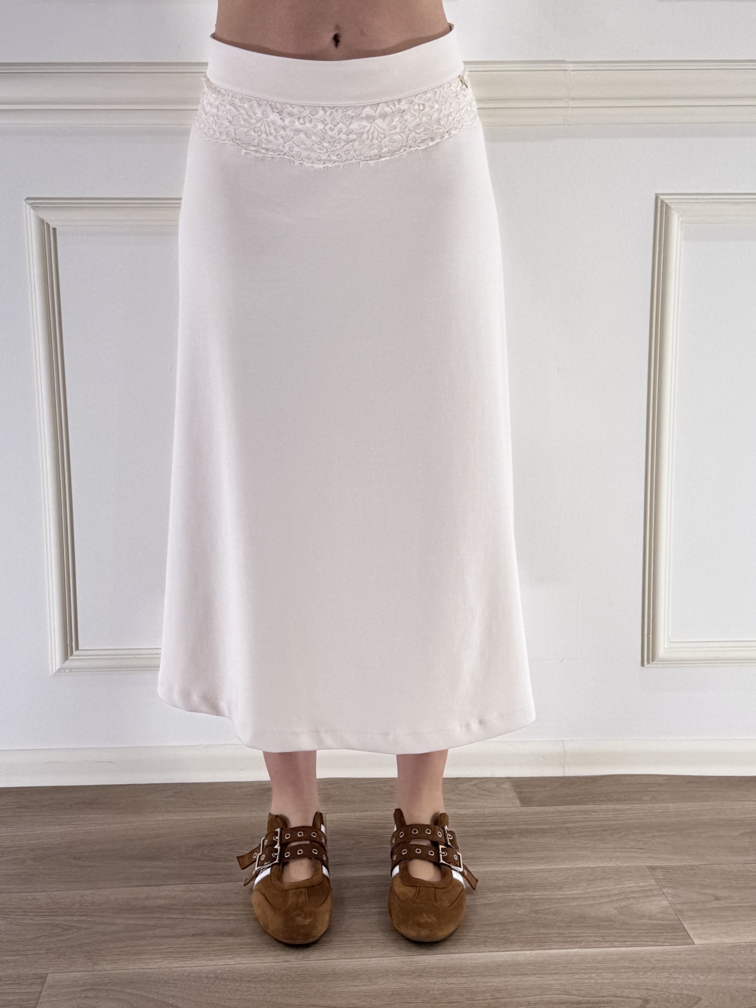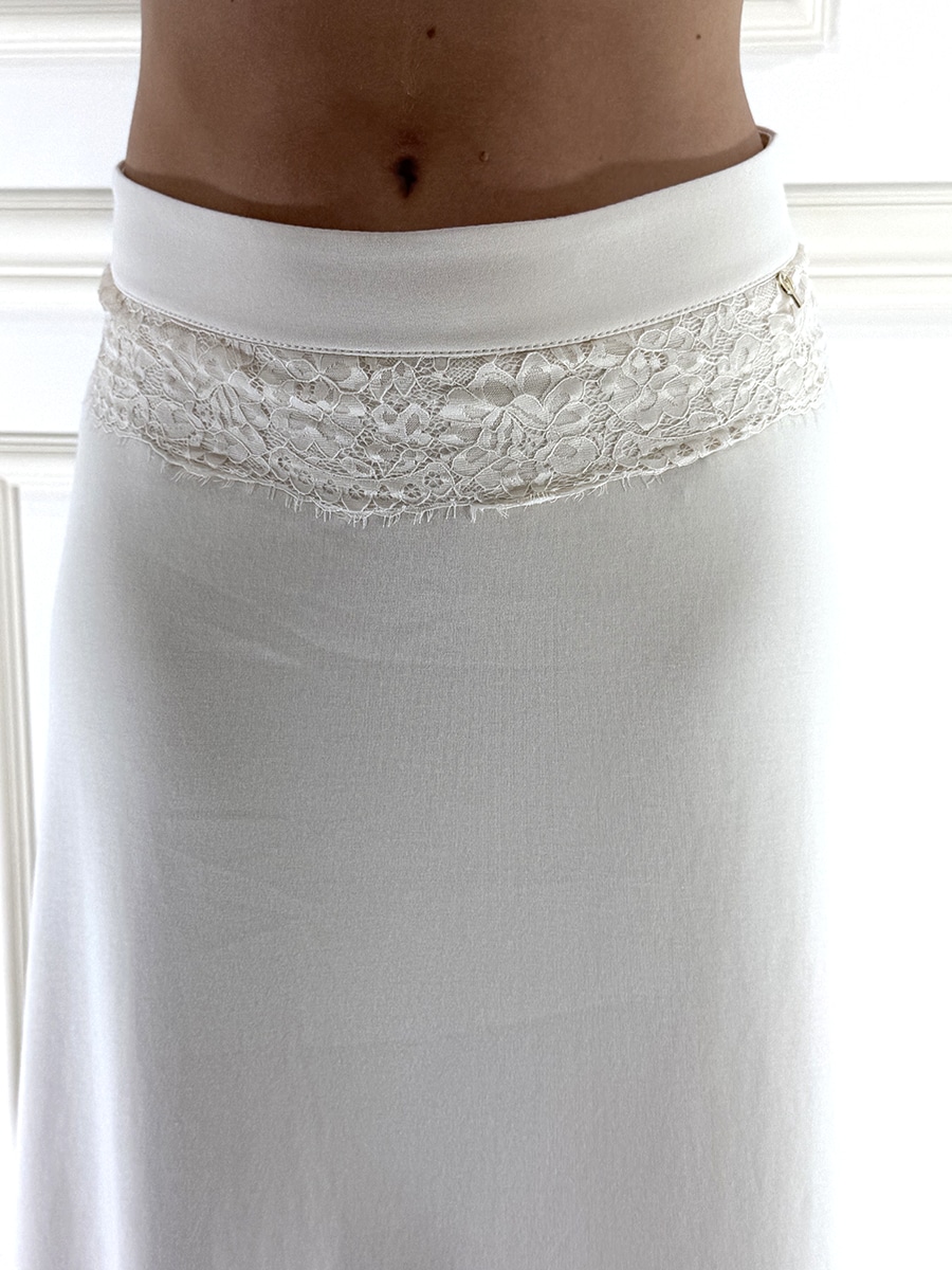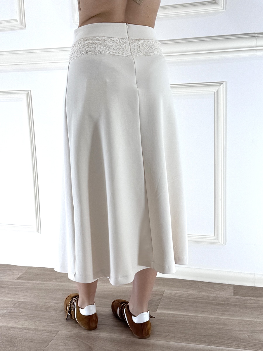 Gonna svasata in misto cotone , morbida ed elasticizzata , zip invisibile sul retro per la chiusura. Pizzo applicato sul bordo.
