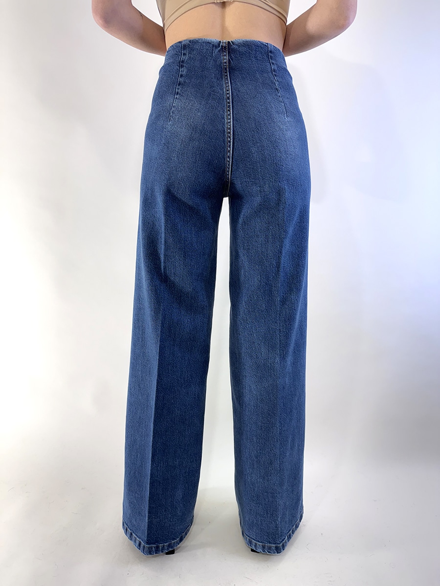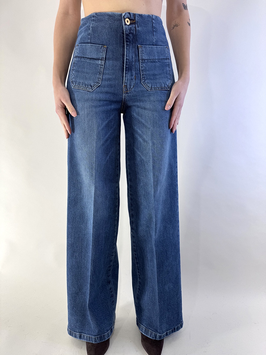 Jeans modello palazzo con taschini frontali. tessuto morbido per il massimo confort, vita alta. che esalta e delinea la silhouette.