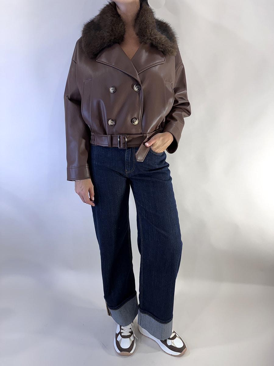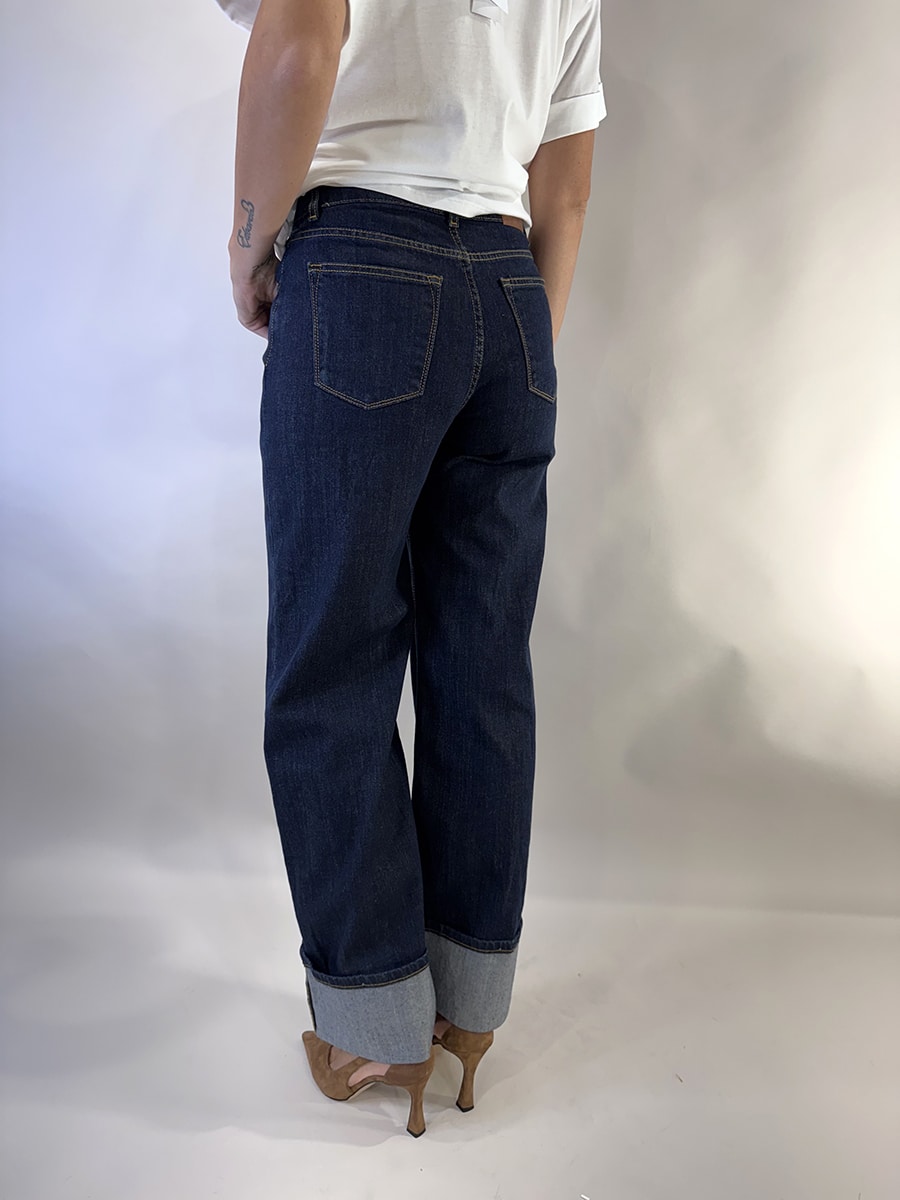 Jeans elasticizzato a gamba larga in denim scuro con risvolto ampio sul fondo, vita media e taglio dritto, ideale per look casual quotidiani o per un abbigliamento elegante con tacchi e camicia.