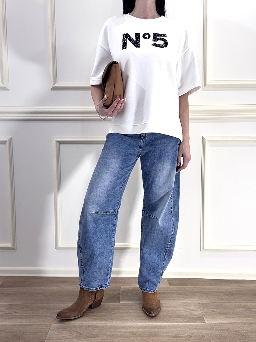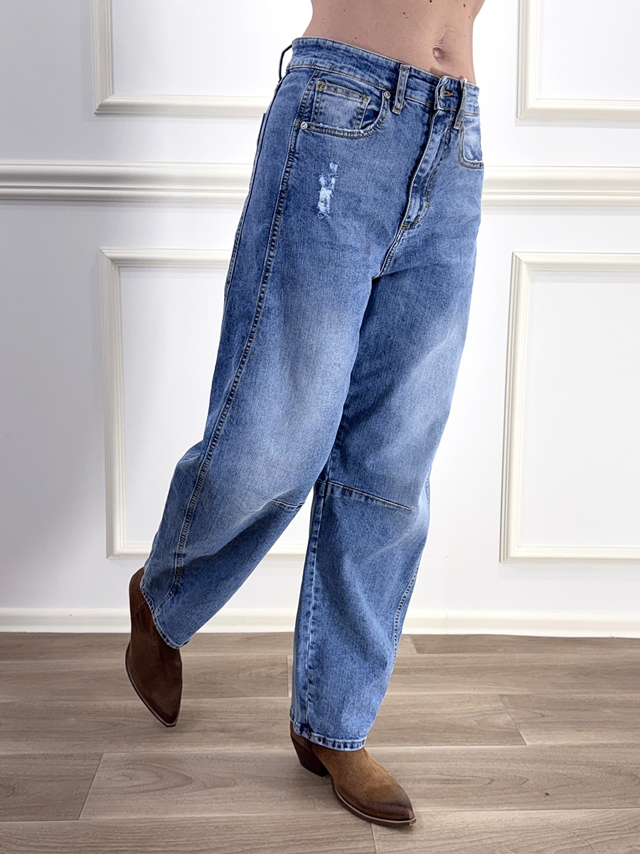 Jeans modello baloon , lavaggio delavè sul davanti , vita regolare, modello 5 tasche , zip e bottone per la chiusura,leggermente elasticizzato.