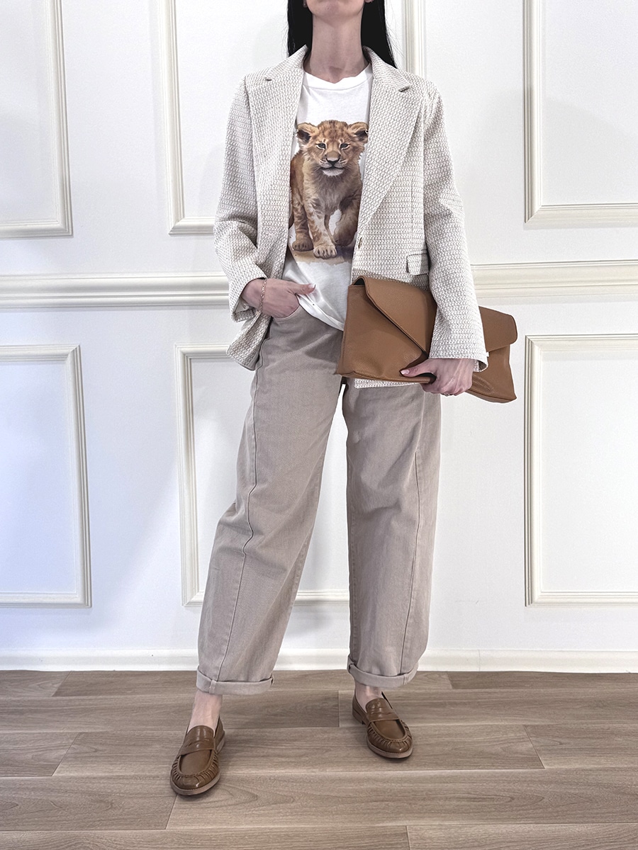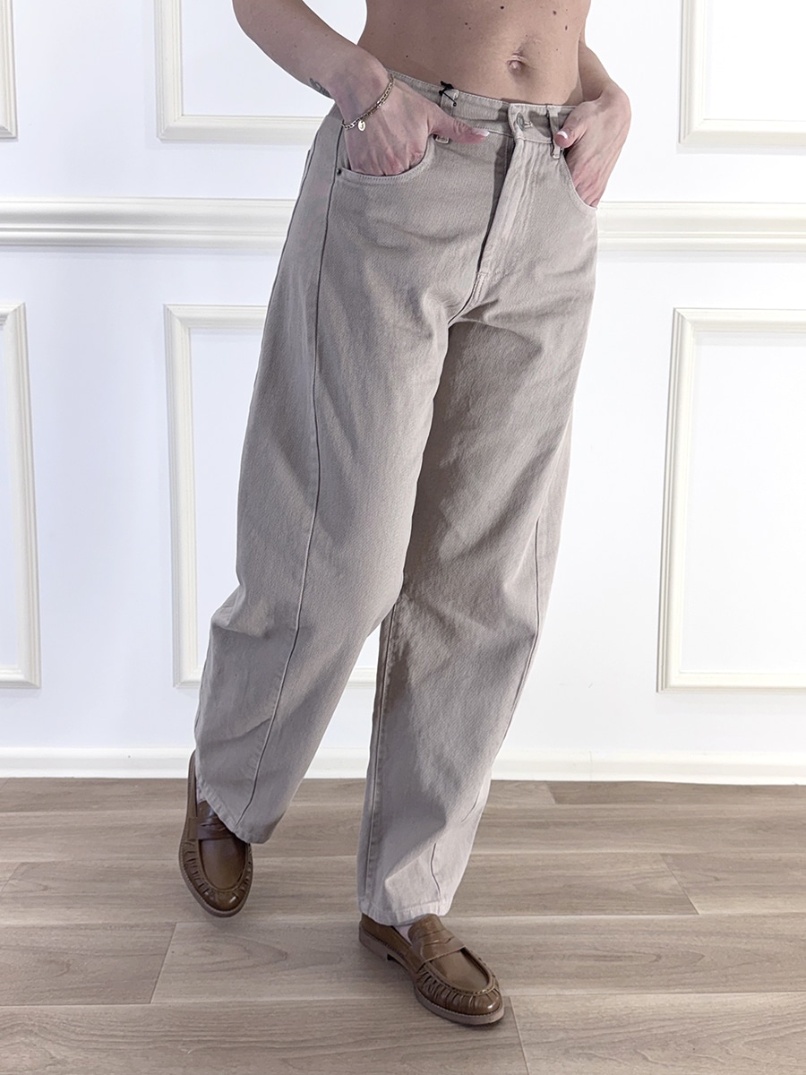 Jeans modello barrel , zip e bottone per la chiusura , modello 5 tasche, vita regolare.