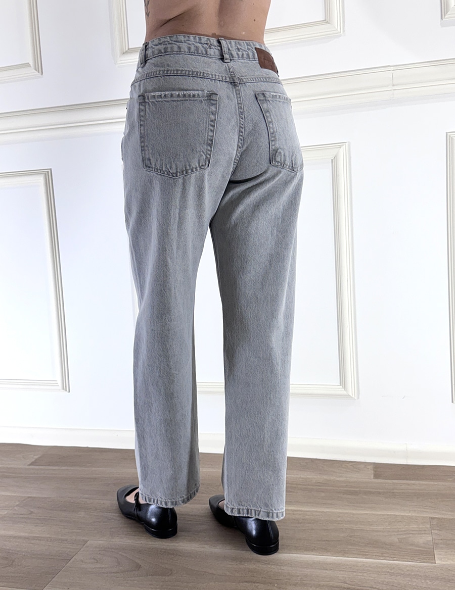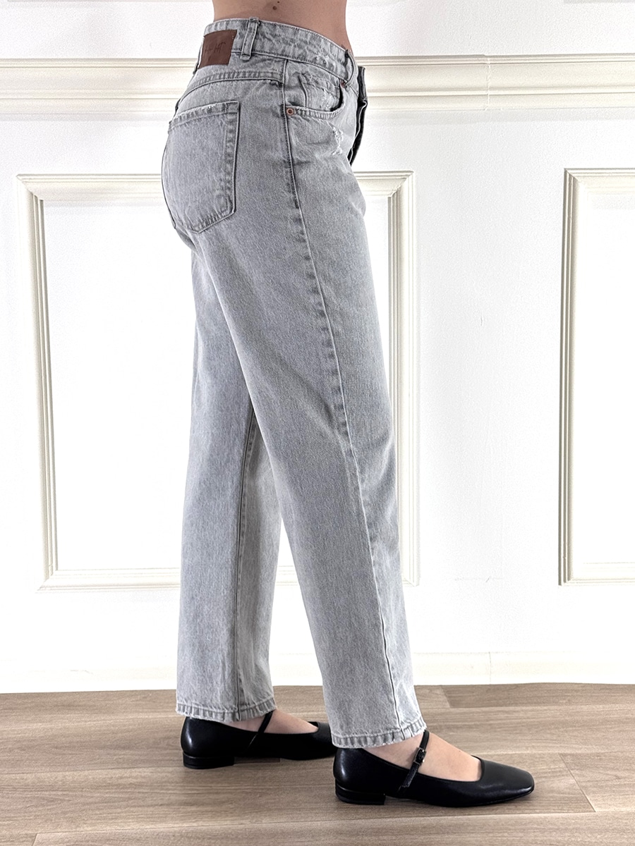 Jeans modello boy , lavaggio grigio chiaro , zip e bottone, modello tasche , vita regolare con rotture.