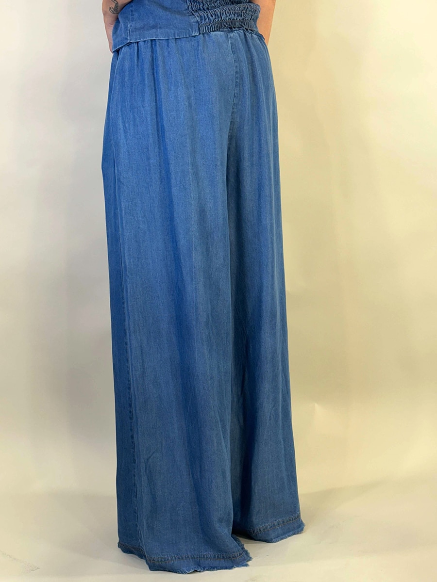 Jeans in chambray gamba larga con elastico e coulisse in vita , tessuto leggero e fresco,  sfrangiato in fondo , versatile , perfetto se abbinato al gilet. Ideale sia di giorno anche con sneakers che di sera con sandali e decolletè