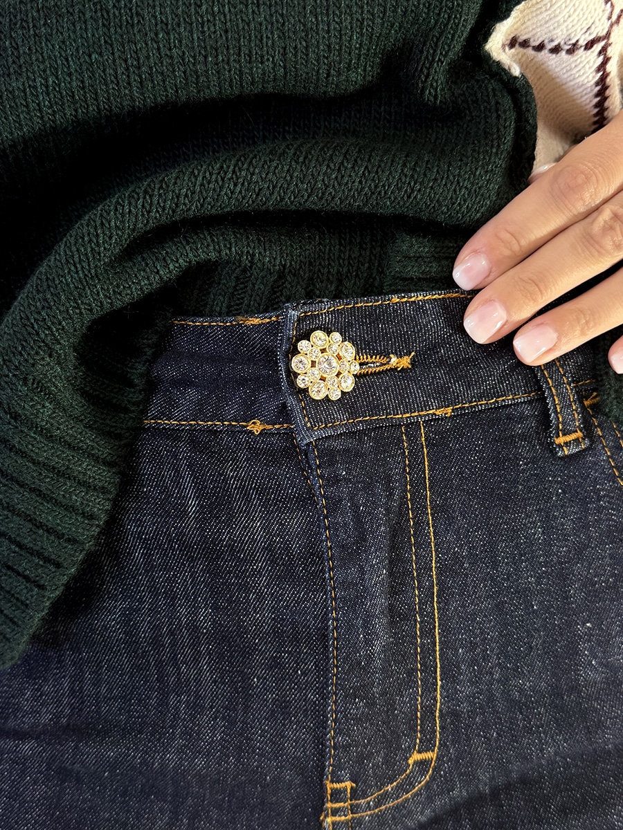 Vita regolare , modello 5 tasche , il bottone gioiello conferisce leganza e femminilità al denim di colore blu scuro.