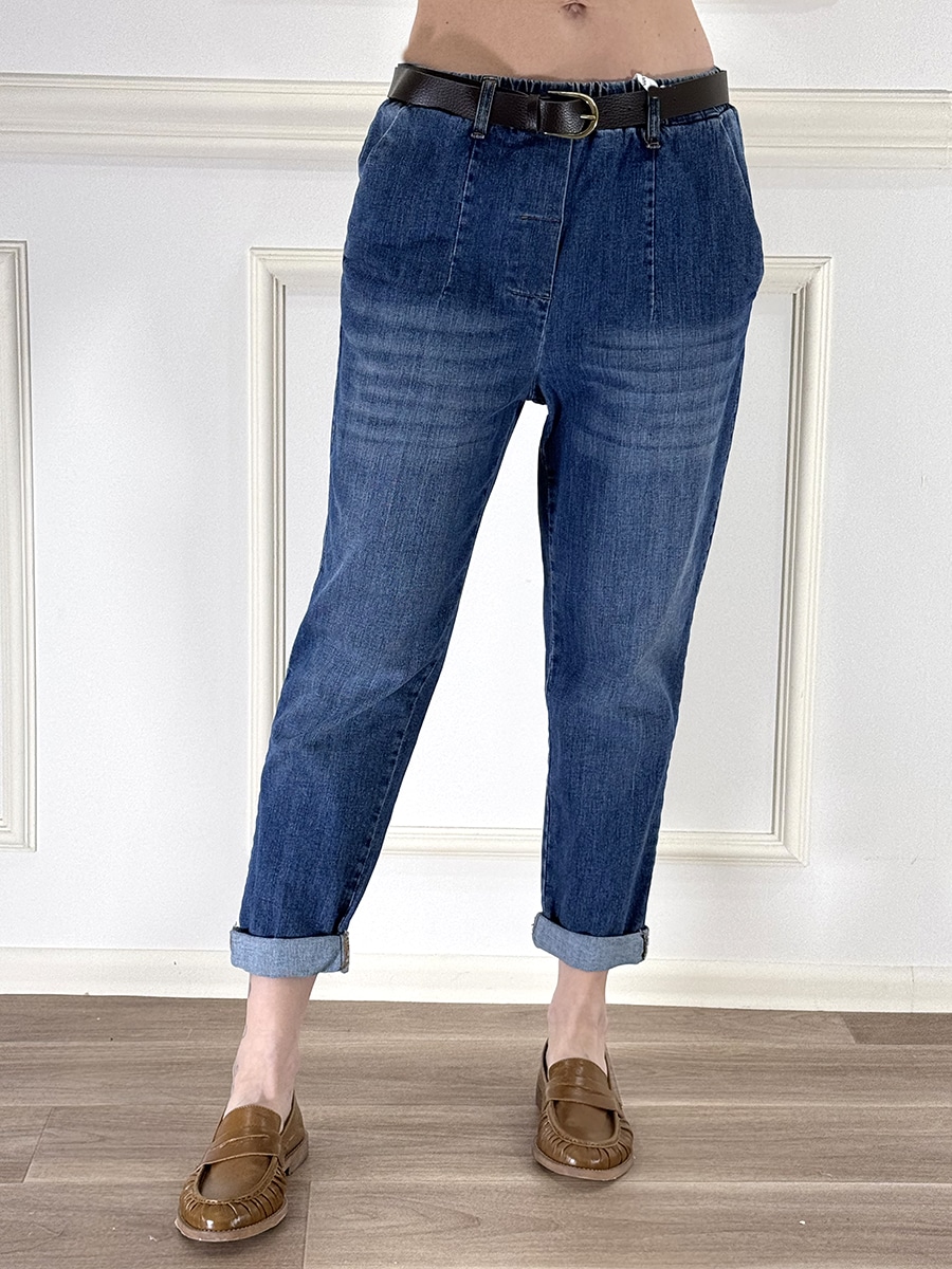 Jeans modello boy con elastico in vita , lavaggio blu con sfumature .