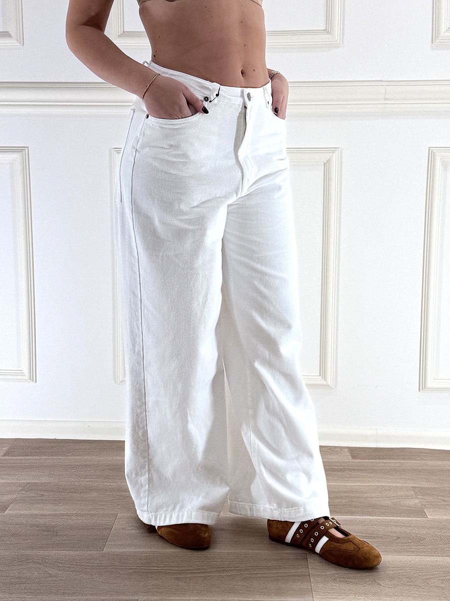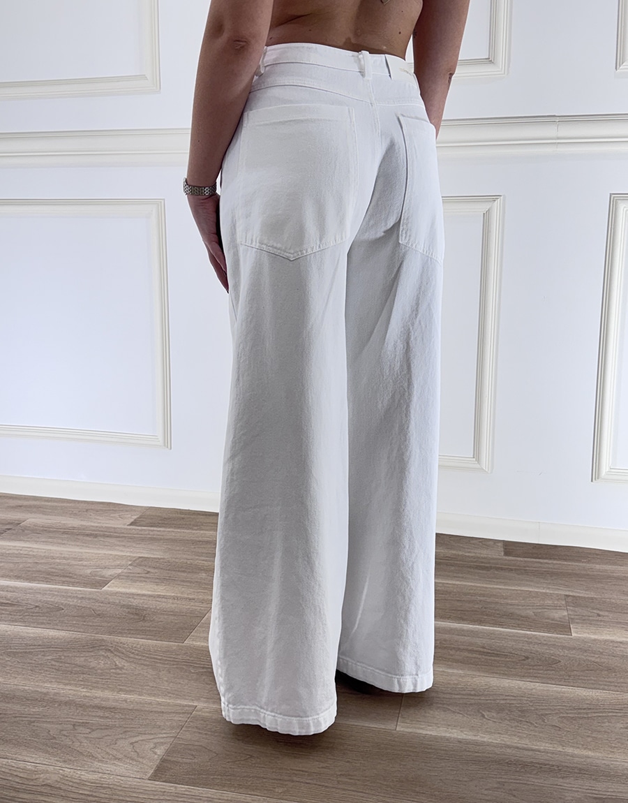 Pantalone modello jeans, zip e bottone davanti per la chiusura, gamba larga. Vita regolare.