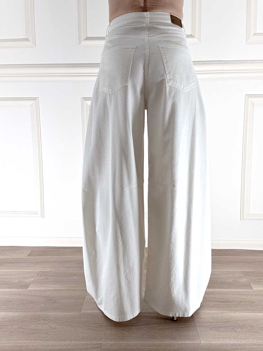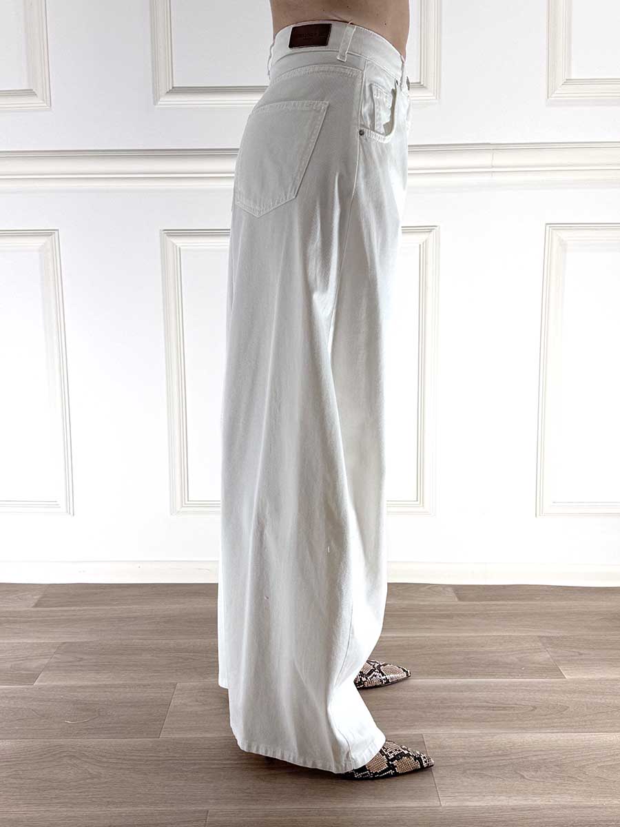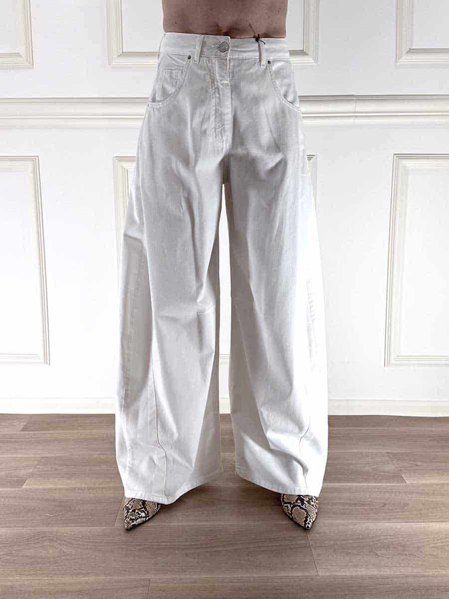 Jeans in cotone tela leggera modello louvre ampio , zip e bottone davanti per la chiusura. Vestibilità comoda.