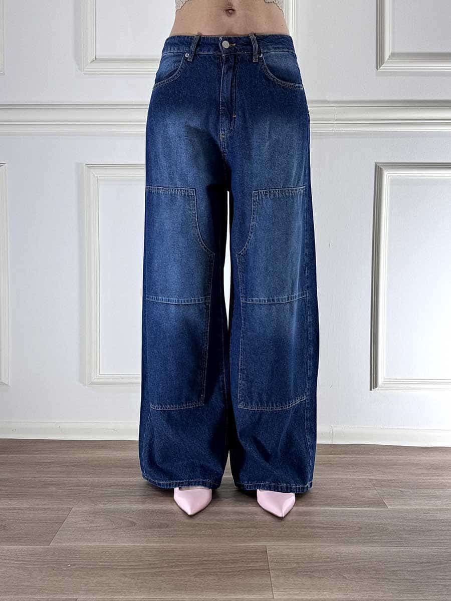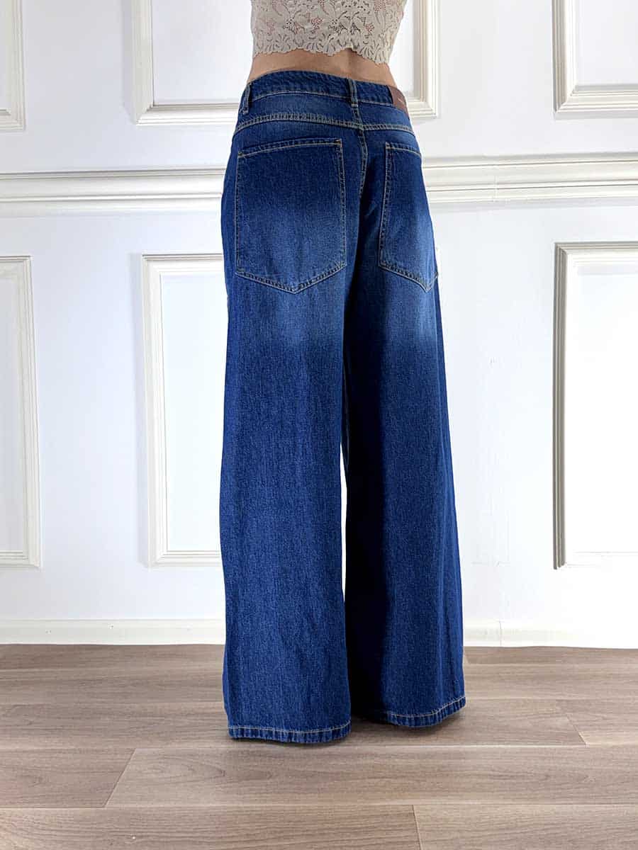Jeans  modello gamba ampia , zip e bottone per la chiusura, 4 tasche .