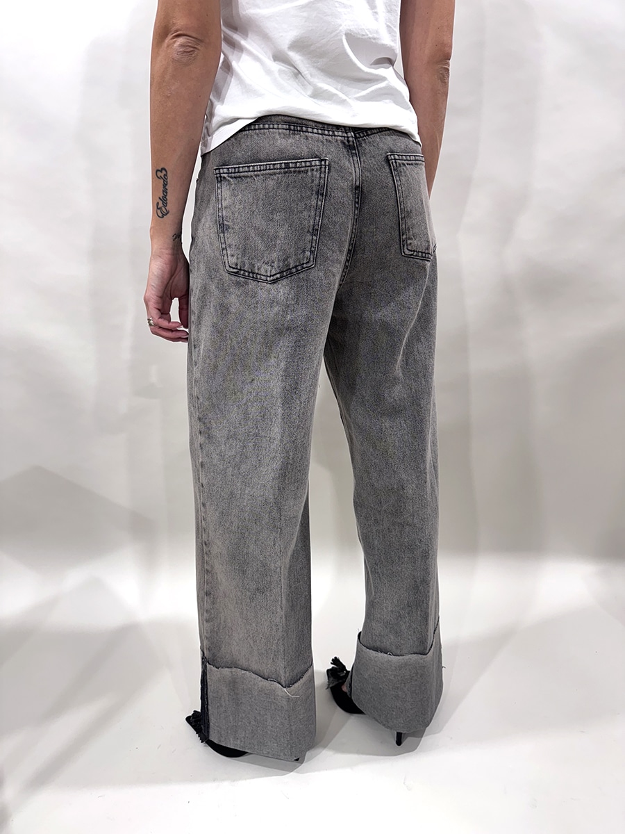 Jeans modello palazzo con risvolto in fondo , zip e bottone per la chiusura.