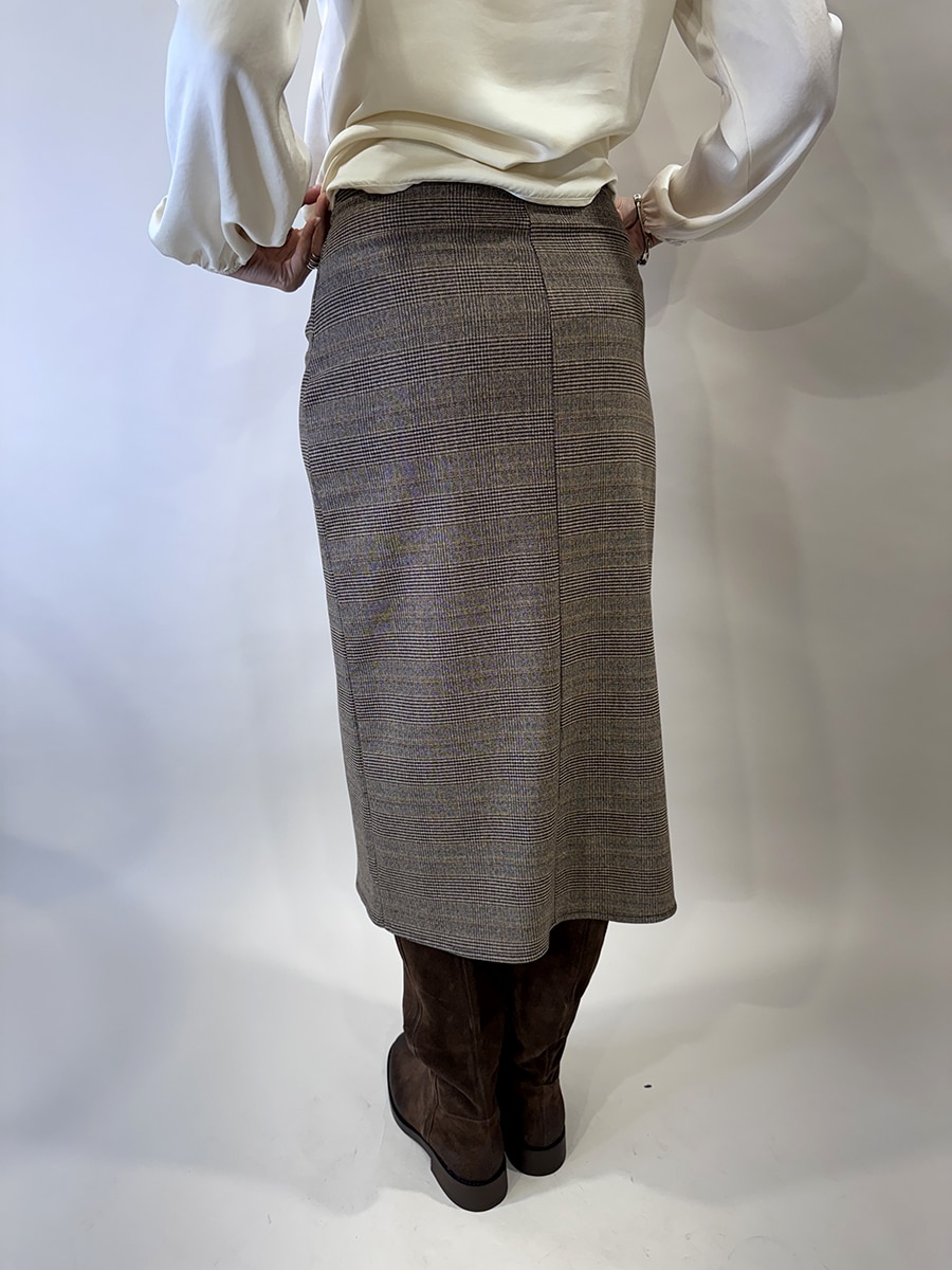 linea dritta e avvolgente ,con lunghezza al polpaccio.Chiusura a doppi bottoni laterali in vita,che creano un effetto asimmetrico elegante.