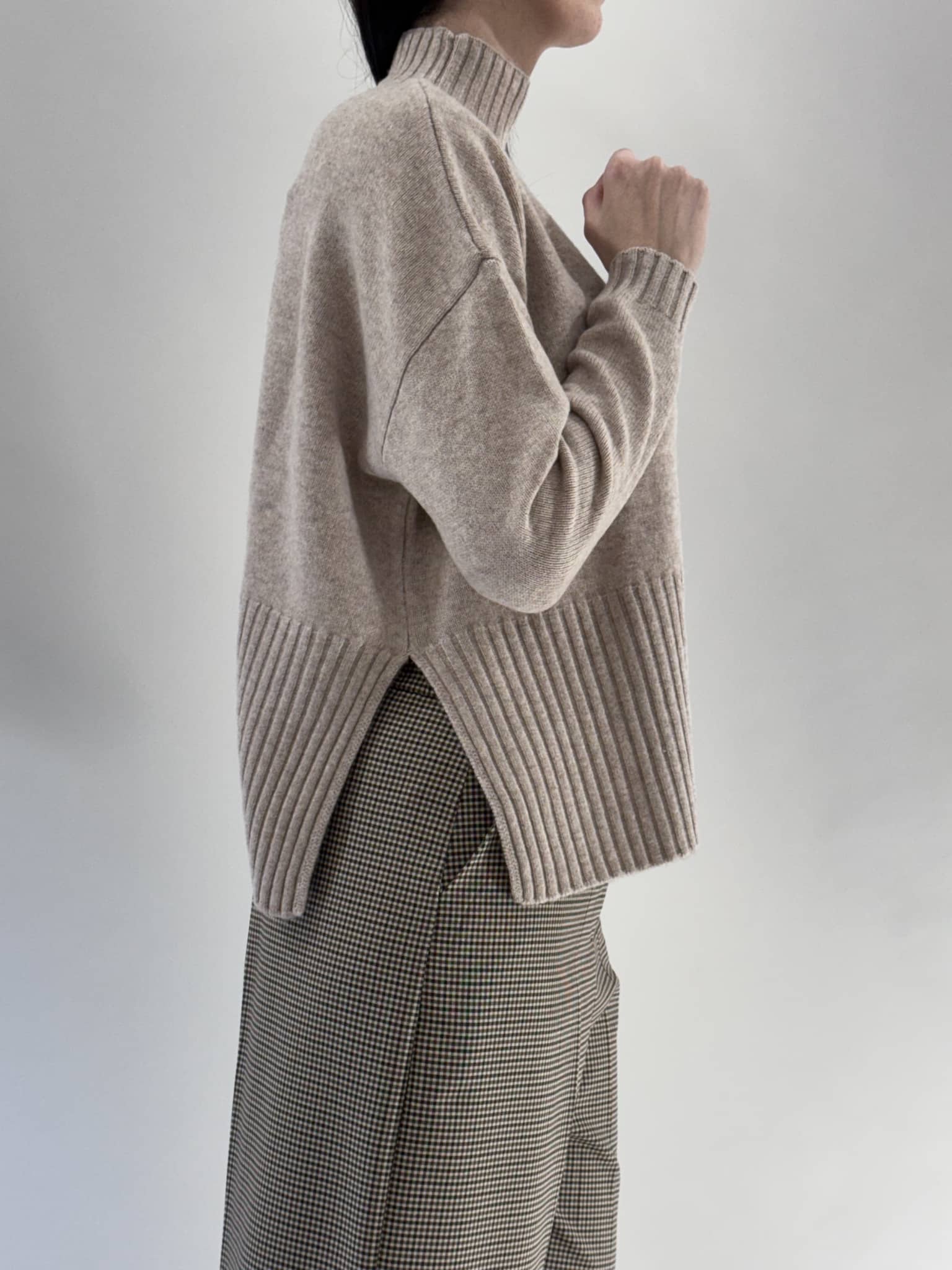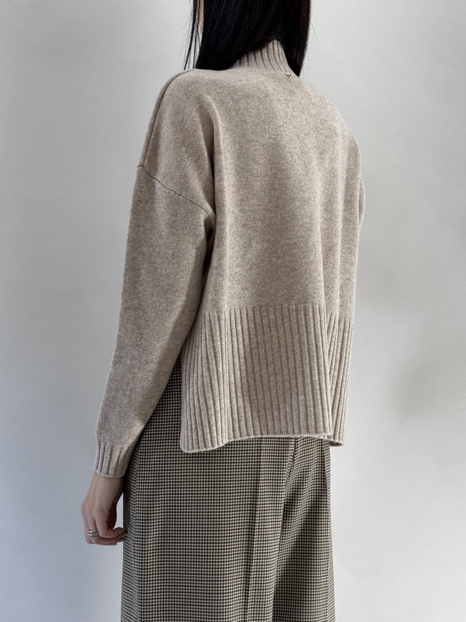 Dolcevita collo altro con profili a costine, texture morbida , vestibilità comoda, spacchetti laterali .