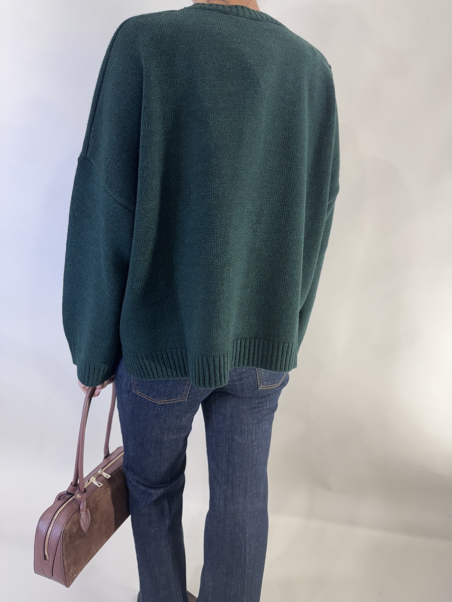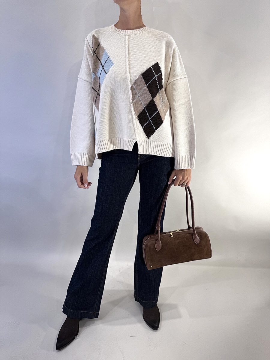 Maglia a maniche lunghe e dal taglio morbido, con girocollo a costine. Motivo a losanghe sul davanti. Ha bordi a costine su collo, polsi e fondo, in stile casual e leggermente oversized. Disponibile nelle varianti verde e panna