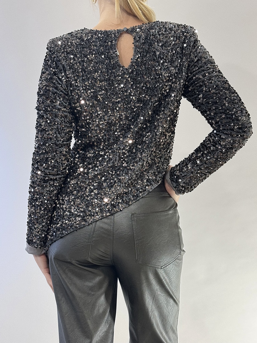 Maglia asimmetrica in ciniglia con paillettes , girocollo.