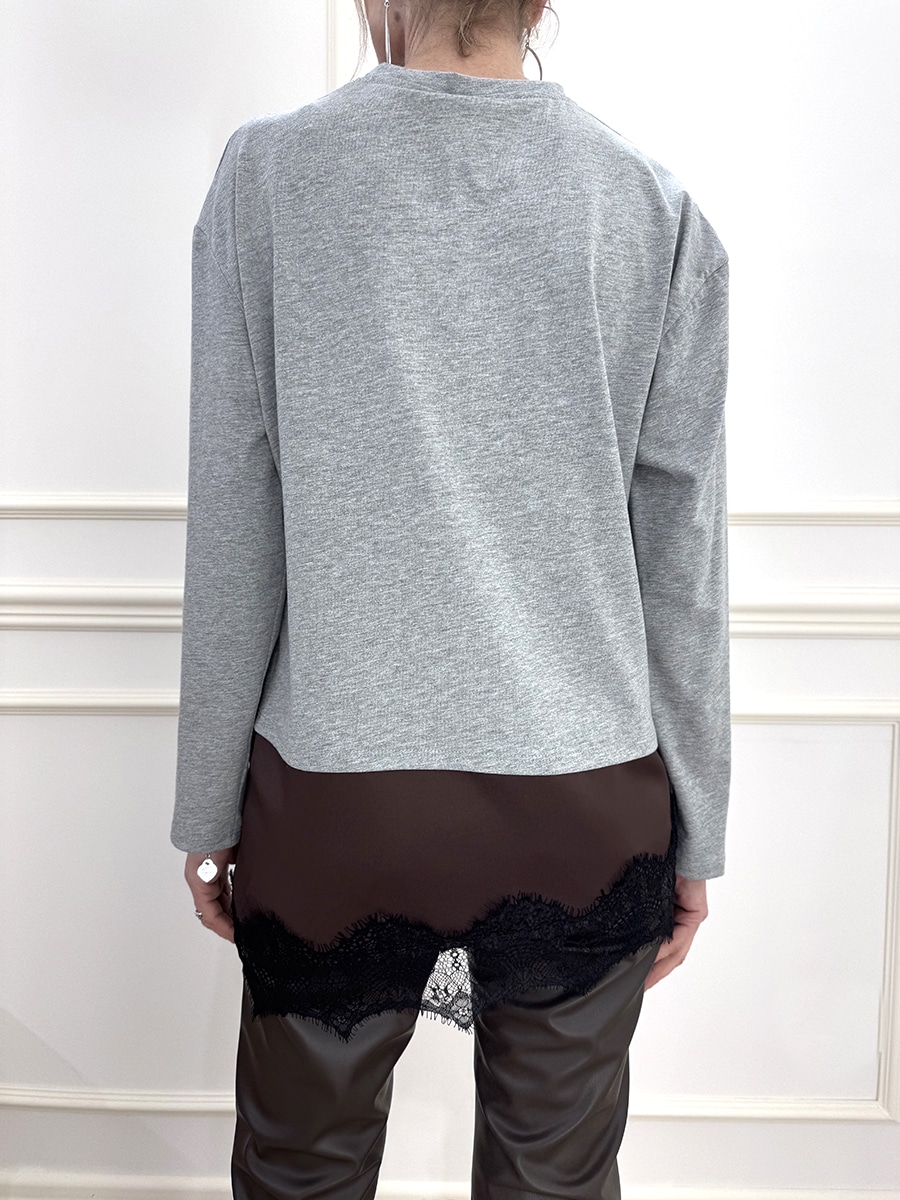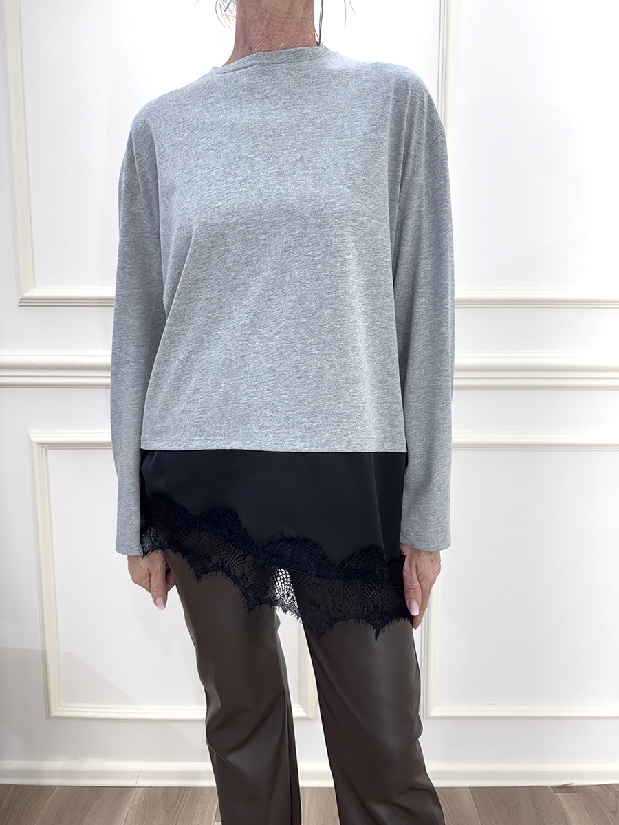 Maglia manica lunga girocollo in cotone , fondo in raso con profilo in pizzo.