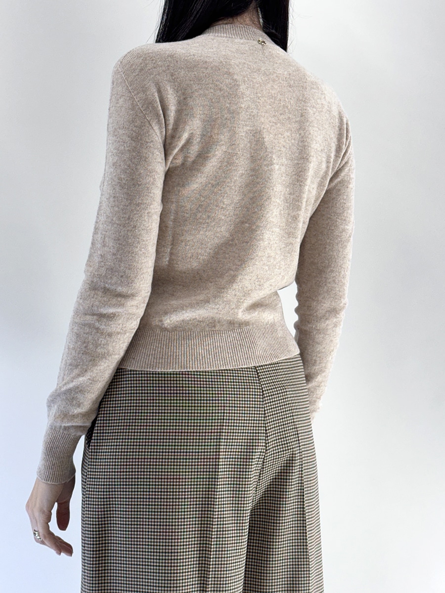 Maglia leggera a maniche lunghe con scollo a V e finiture a costine su collo, polsini e fondo. Vestibilità aderente ma confortevole, ideale come capo basico e versatile. Disponibile in tre varianti colore: cammello, blu navy e cacha.
