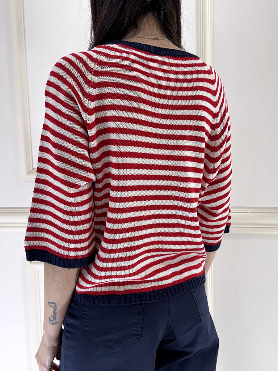 Maglia rigata in filo leggera , mancia a 74 colletto in contrasto , vestibilità comoda.