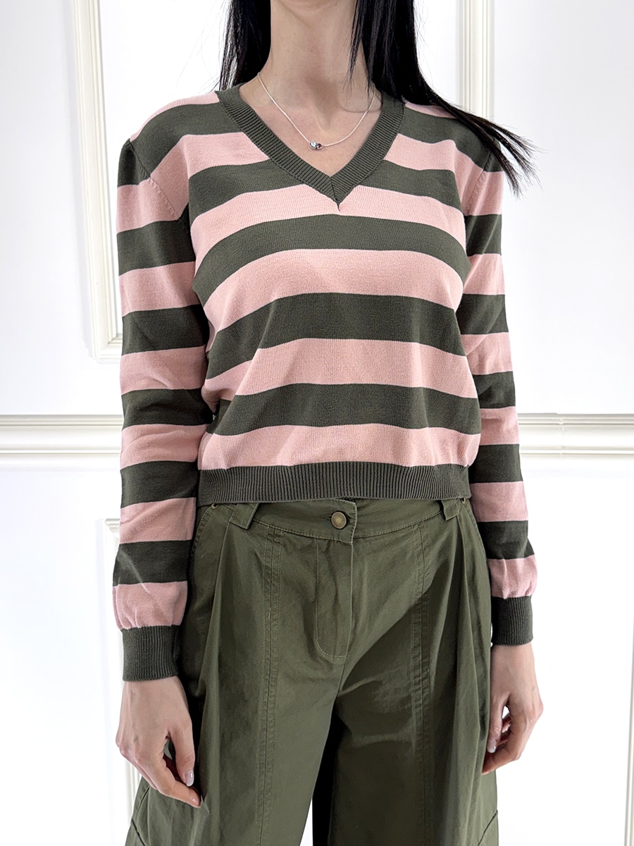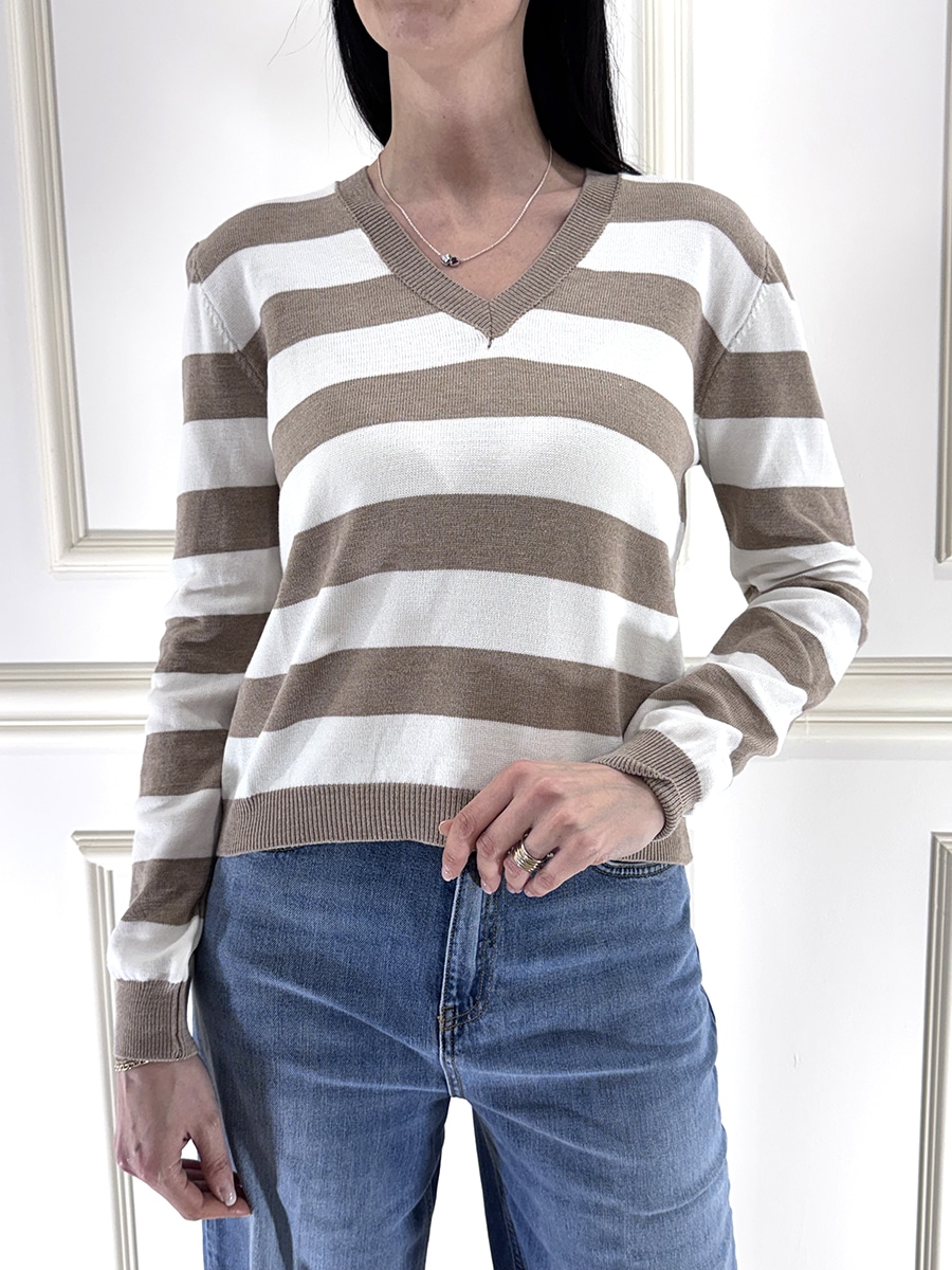 Maglia a righe scollo a , manica lunga , vestibilità comoda, bordi a coste.