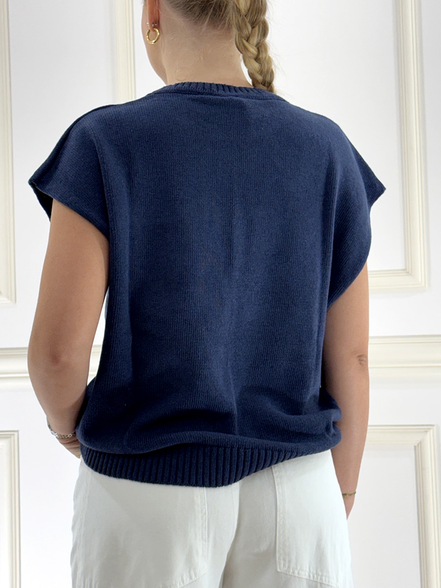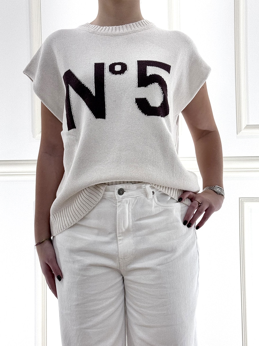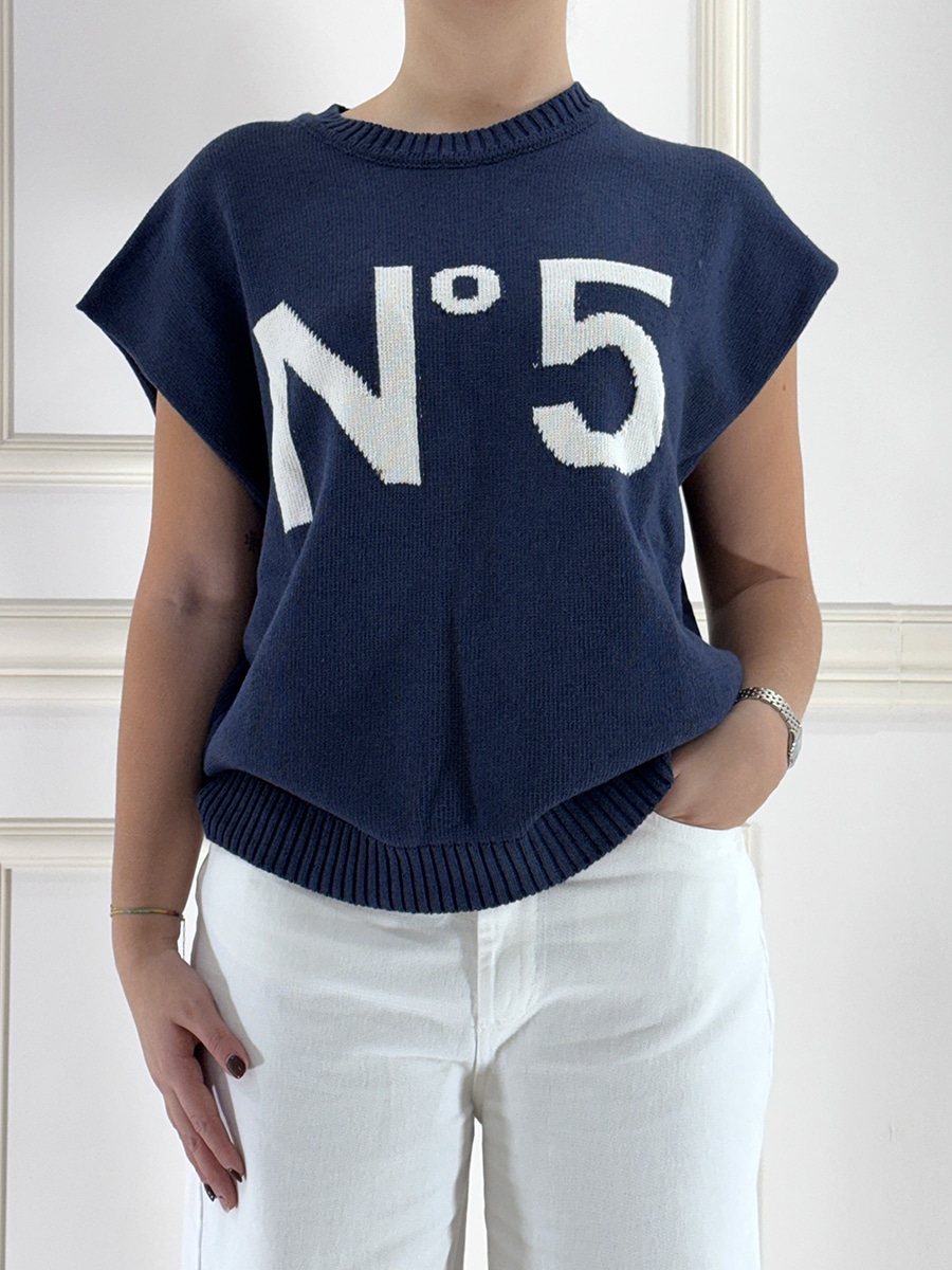 Gilet smanicato con n ° 5 in contrasto sul davanti , capo versatile e Texture morbida.